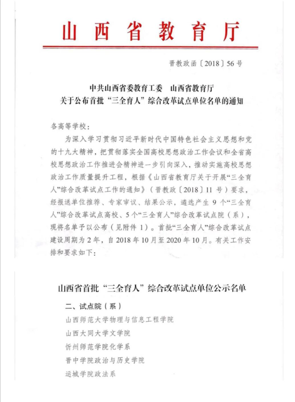 山西省首批“三全育人”综合改革试点院系