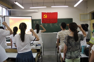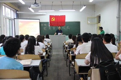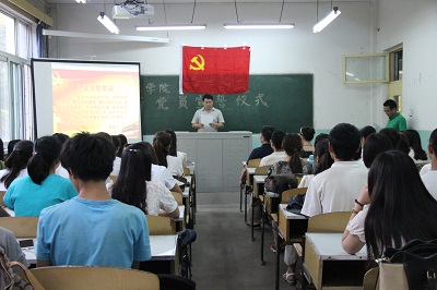 仪式以奏唱国际歌开始,接着,公司党委副书记陈向波宣读了新党员名单,然后1304班许媛媛同学代表17名新党员发言,1403班秦源同学代表全院入党积极分子发言,接下来,17名新党员在鲜红的党旗下举行了庄严宣誓。