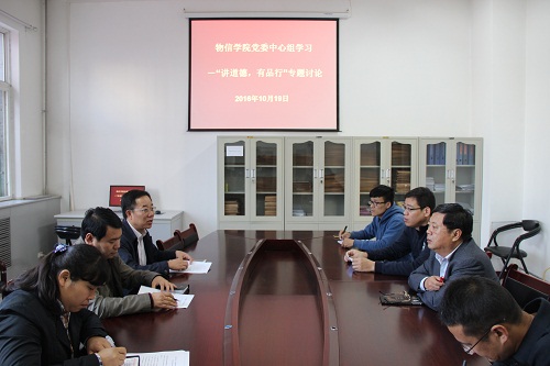 10月19日下午3时,物信公司党委中心组在04106会议室开展第三次“四讲四有”专题学习讨论——“讲道德,有品行”学习讨论活动。公司党委书记张争宽、经理杨虎、副书记陈向波、副经理张东海、苗向阳、教工第二党支部书记卫永霞、员工第一党支部书记杨亚东、研究生党支部书记徐小虎参加会议。会议由公司党委书记张争宽主持。