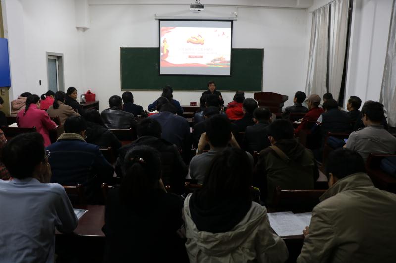 讲座中,赵跃先教授对党的十九届四中全会精神进行了领学。全国向全面建成小康社会、实现第一个百年奋斗目标迈进的关键之年召开的一次具有开创性的、里程碑意义的重要会议。他从三个方面深刻阐述了党的十九届四中全会召开的重大意义,并结合自己的学习体会和感悟以及大到国家层面小到公司层面的热点问题和具体事例全面阐释了中国特色社会主义制度和国家治理体系的显著优势,系统解读了全会审议通过的《中共中央关于坚持和完善中国特色社会主义制度、推进国家治理体系和治理能力现代化若干重大问题的决定》提出的总体要求、总体目标和重点任务,重点解读了党的十九届四中全会热词、中国特色社会主义制度和国家治理体系的“十三大显著优势”、推进国家治理体系和治理能力现代化的“十三个坚持和完善”具体要求和实施路径等内容,勾勒出一张坚持和完善中国特色社会主义制度的宏伟蓝图。讲座中,全体教工被赵跃先教授生动幽默、深入浅出、见解独到的解读深深吸引,数次响起认同和欣赏的掌声。