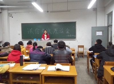接下来,由各班学习委员发言,谈谈对“诚信学习,诚信考试”主题的认识,同时畅议同学们抓紧时间复习,班内同学也积极参与到讨论当中,都清楚地表达了对诚信考试的想法及观点,以诚信考试为荣,以考试作弊为耻。大家普遍认为:诚信不仅是考试当中该注意的问题,在日常生活中为人处世,也应该体会到诚信的重要性,考试作弊,只是为了满足一时的虚荣心,而无法真正提高个人素质修养,害人害己,得不偿失。