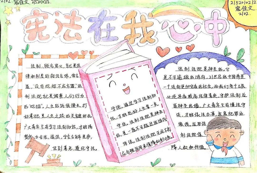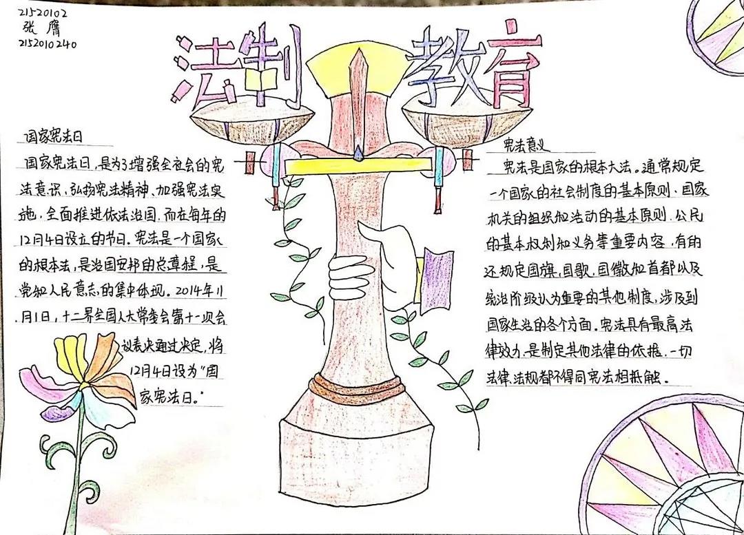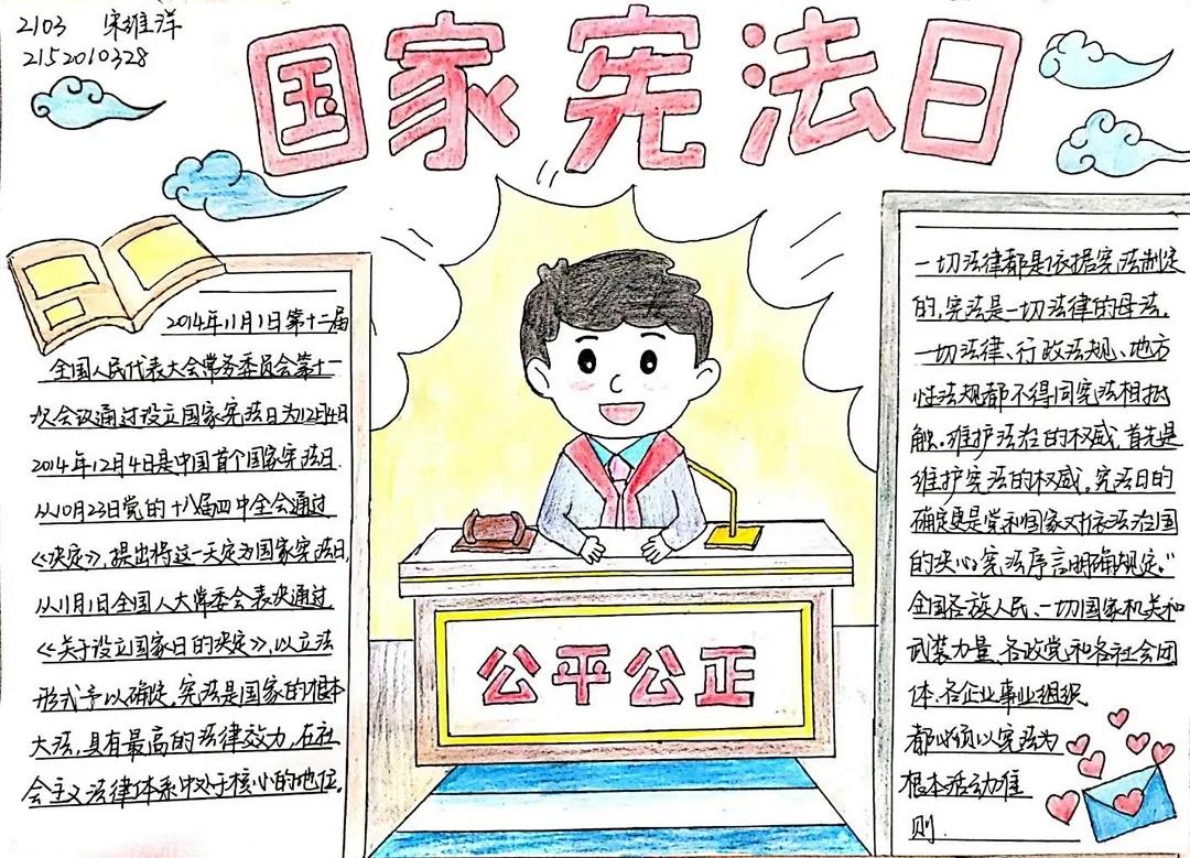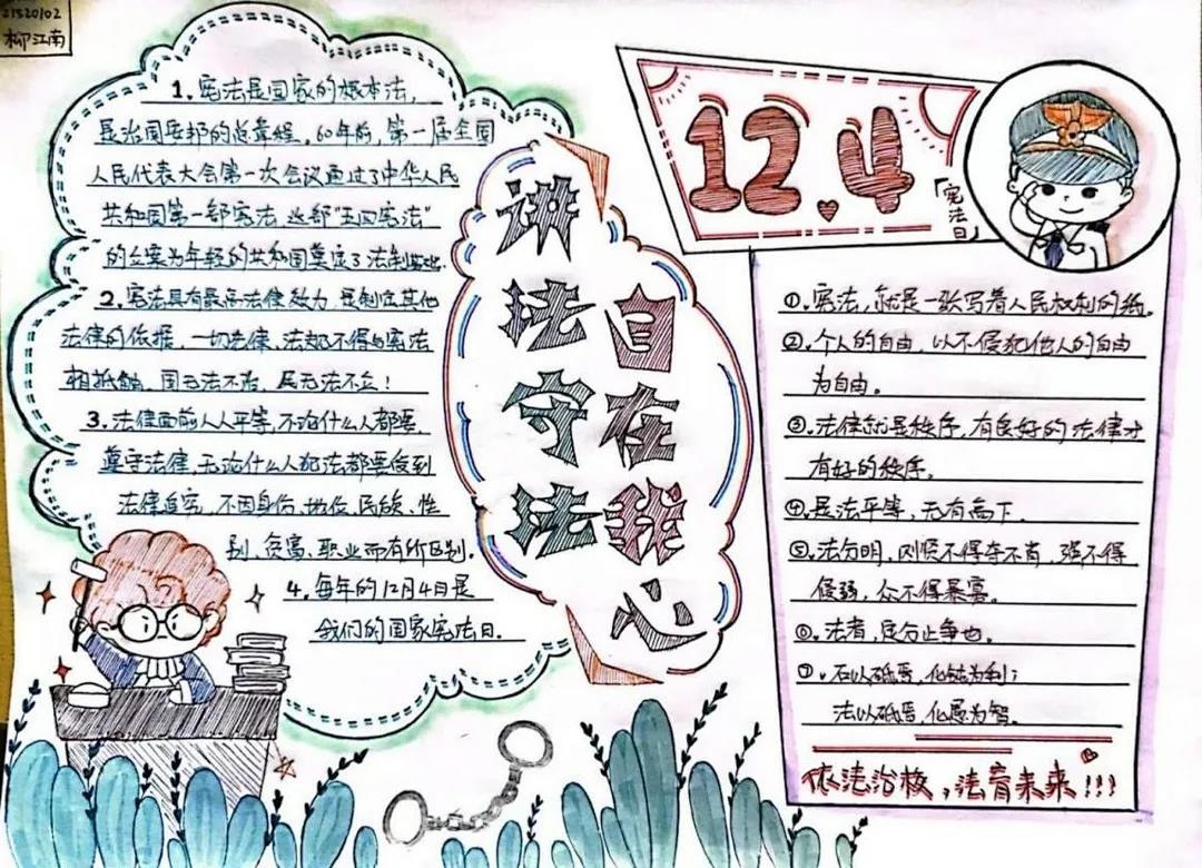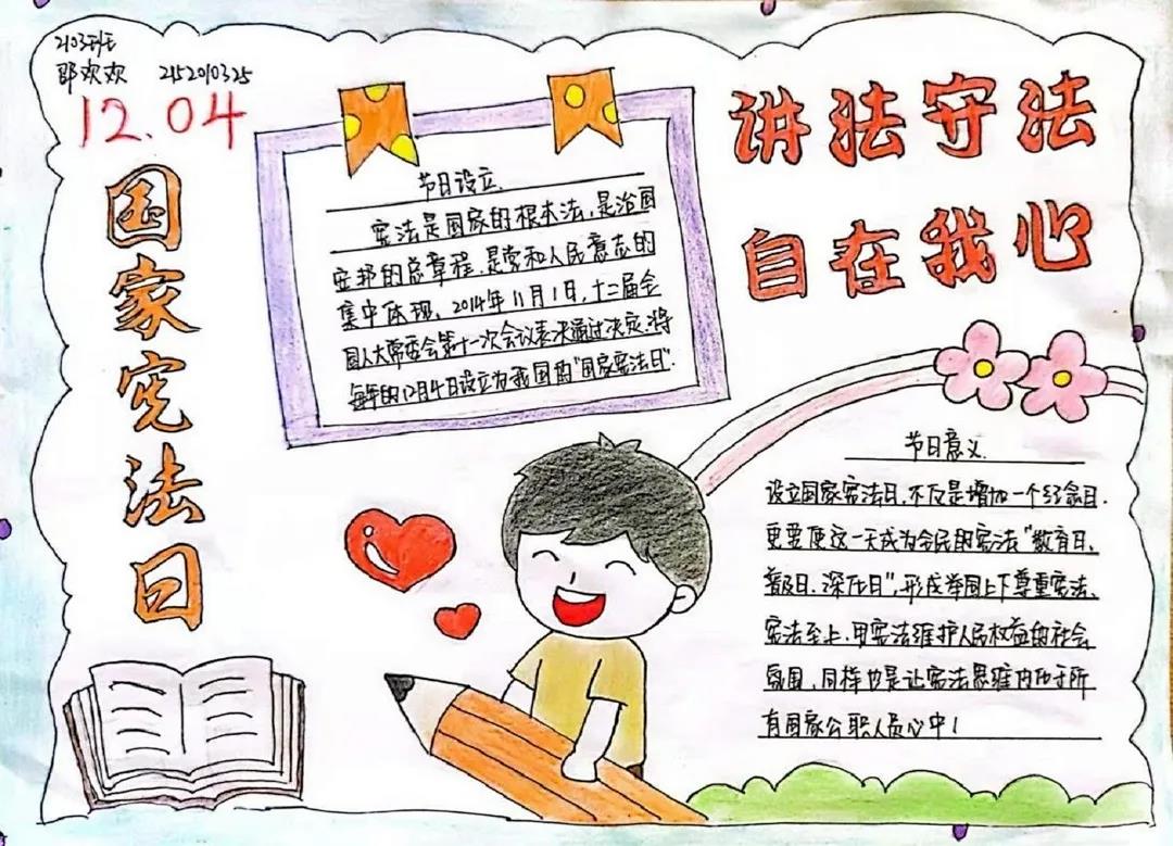 今年的12月4日是我国第八个国家宪法日,为普及宪法知识,弘扬法治精神,引导同学们做尊法学法守法用法的模范,公司新媒体美工组开展了“讲法守法,自在我心”国家宪法日手抄报征集活动。