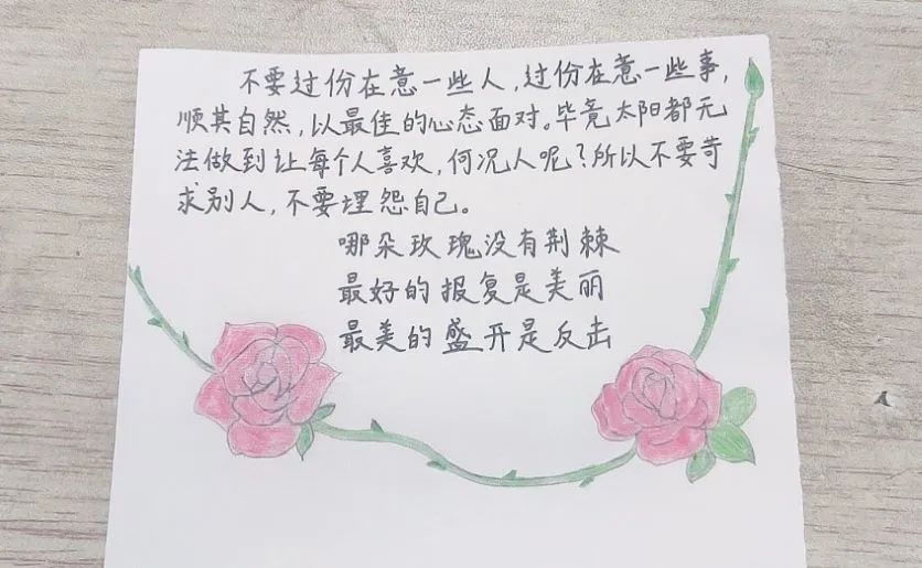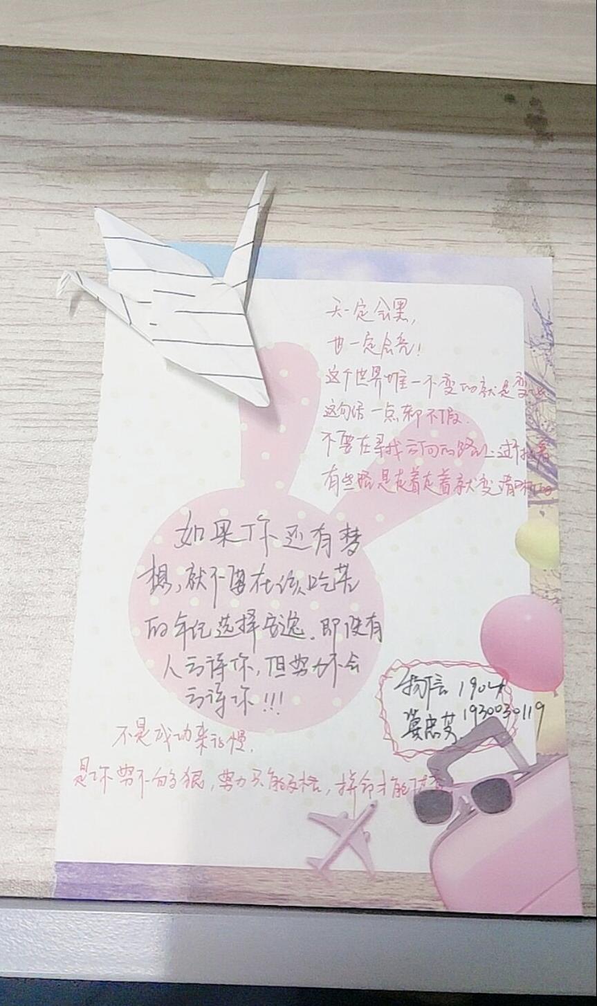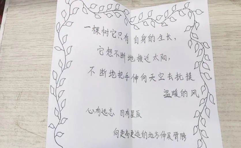 心灵寄语活动。活动中,同学们在自制卡片上写下自己对人生的感悟、体验和感受,通过展览与大家分享,这是给予爱和接收爱的过程。每一个人在爱与被爱中学着敞开心扉,学着传递温暖向上的力量。