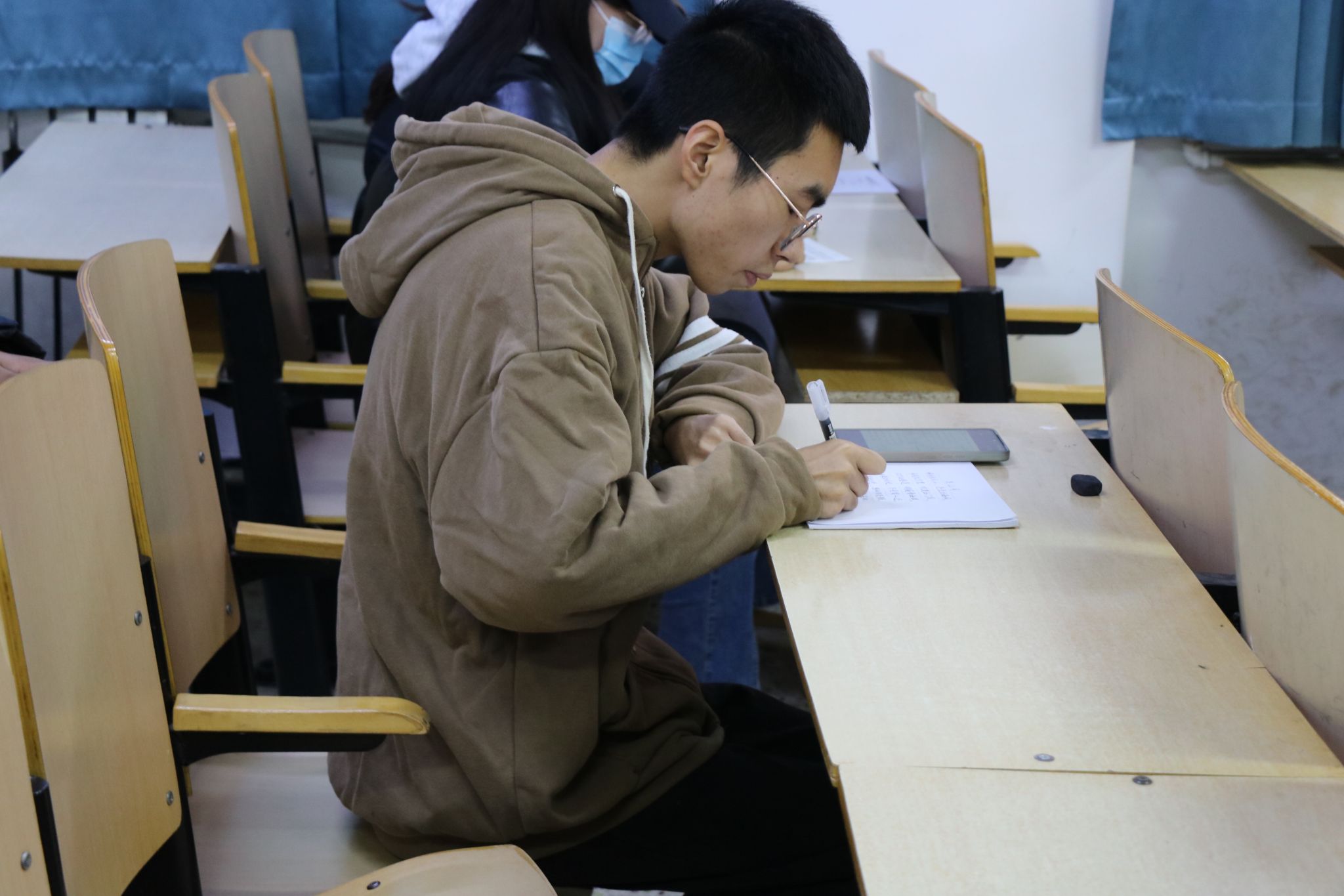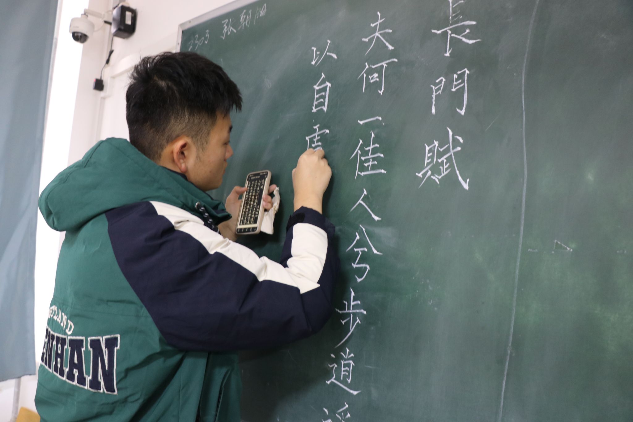 经过线上初赛的角逐,共从62名参赛者中选出24名同学进入决赛。比赛中,参赛选手们要从硬笔、毛笔、粉笔三种形式中选择一种参赛,他们准备充分,游刃有余,用一笔笔铿锵有力的笔画书写出自己的风格。书写结束后,评委们依次从作品的结构、字体、内容、章法等方面点评了各个作品,并评选出了一等奖一名,二等奖两名,三等奖三名。