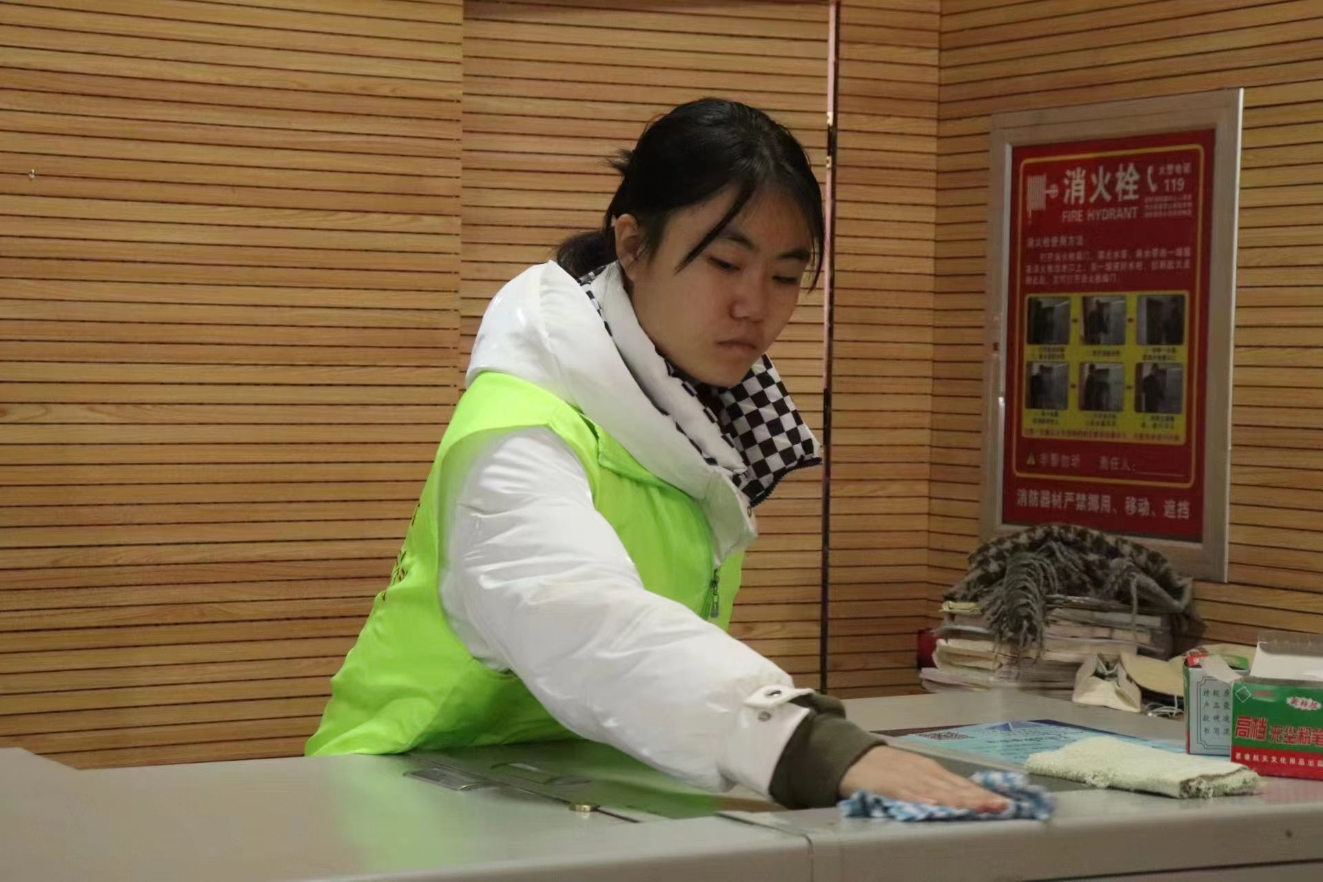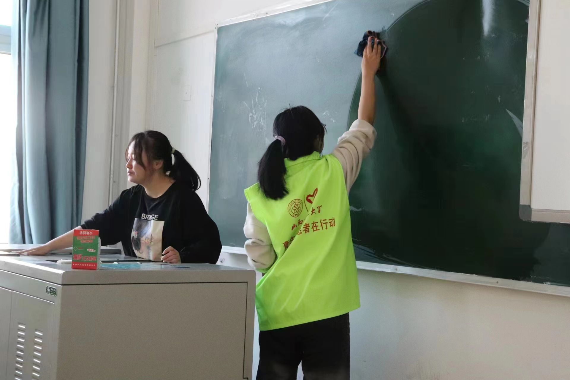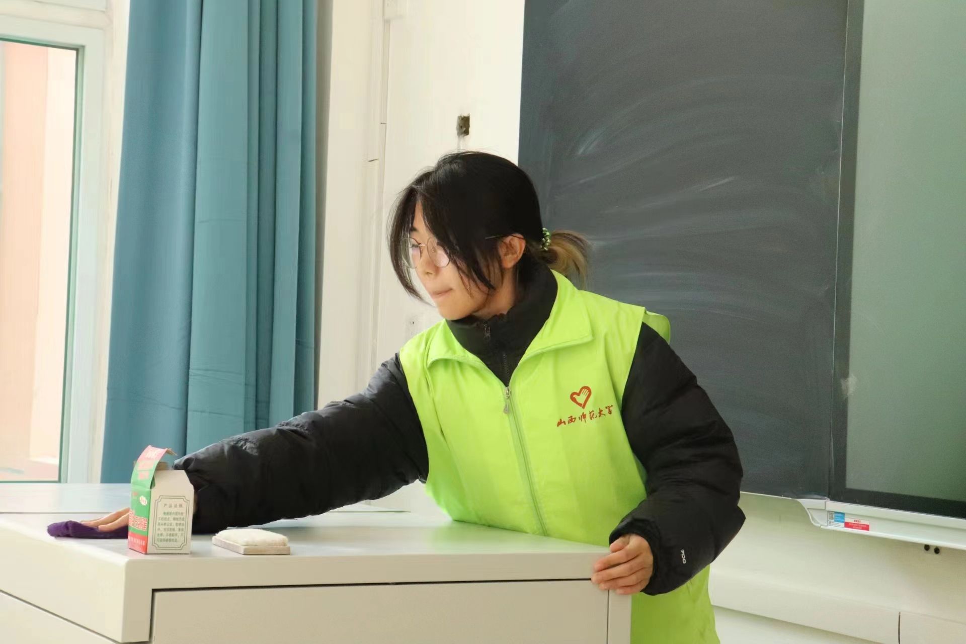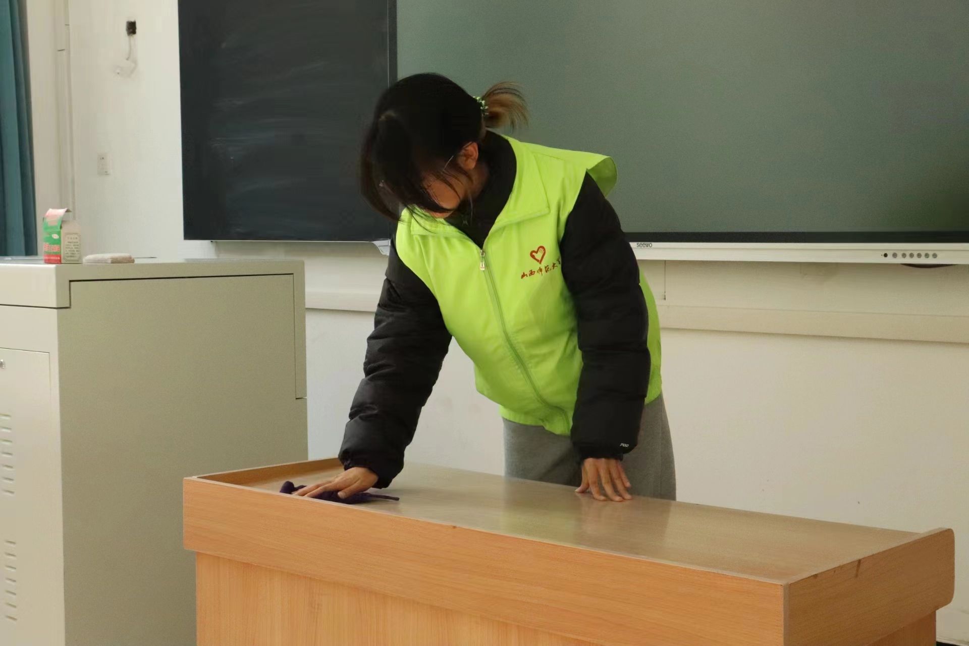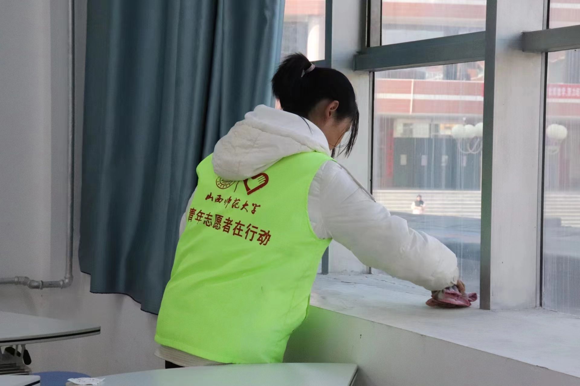 活动前期,志愿者们明确分工,按照一个志愿者清扫两个教室分配任务。活动中,志愿者们纷纷发扬不怕累、不怕脏、肯吃苦的精神,用抹布认认真真擦拭了教室里的窗台、暖气片、黑板、讲桌和多媒体柜,现场一派热火朝天的劳动景象。在所有志愿者的共同努力下,五号楼的所有教室一尘不染、窗明几净、焕然一新。