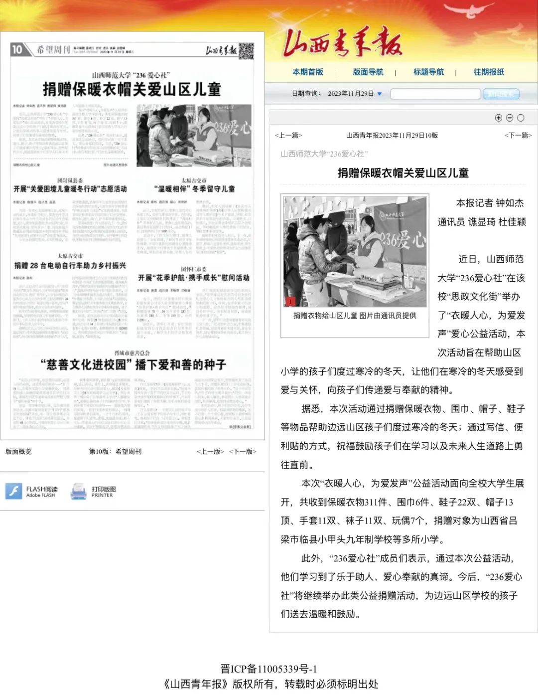 11月29日,《山西青年报》以《捐赠保暖衣帽关爱山区儿童》 为题报道了公司236爱心社“衣暖人心,为爱发声”爱心公益活动。