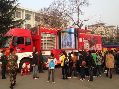 讲座结束后,在巨人广场,由临汾市公关消防支队的官兵为我们进行模拟实战演练。在演练过程中,消防官兵们为我们模拟了烟雾传播的方向,还为我们提供了119报警体验和消防知识趣味测试等,更为我们提供了模拟逃生帐篷,使我们亲身体验了火灾逃生。