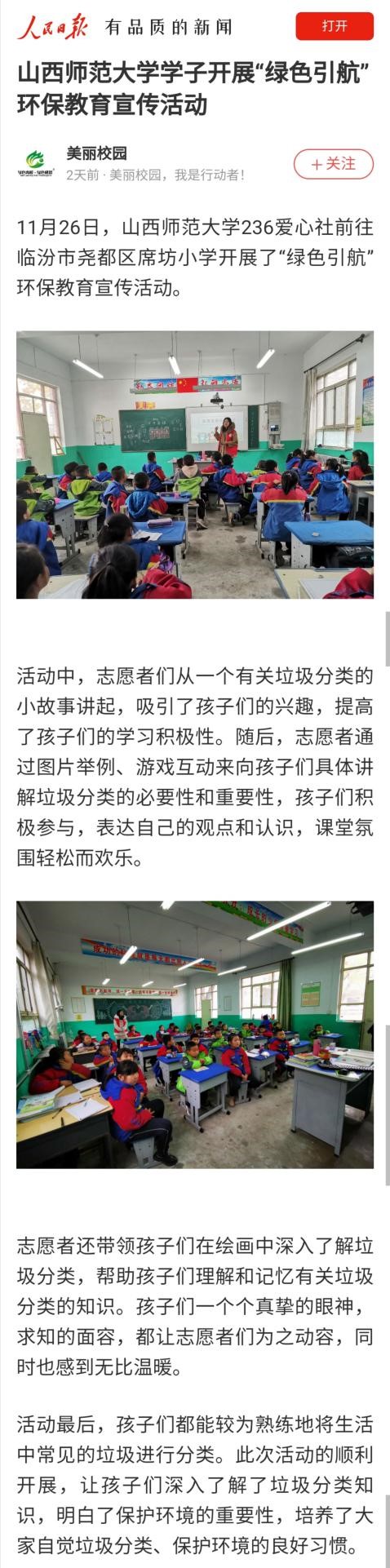 《人民日报》客户端报道公司236爱心社“绿色引航”环保教育宣传活动