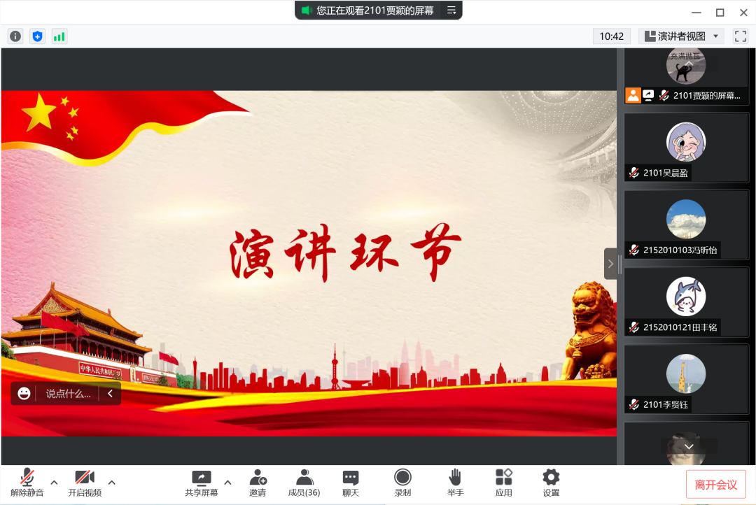 2101团支部组织团支部全体成员进行了主题演讲活动,大家结合PPT以及视频进行声情并茂的演讲,在演讲中,同学们纷纷抒发自己的感悟,表达了要以实际行动迎接党的二十大胜利召开,在新时代新征程上续写新的历史篇章、创造新的时代辉煌!