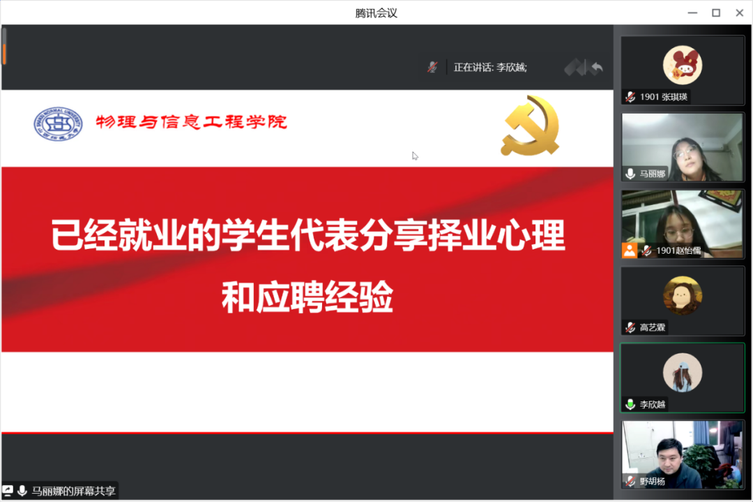 随后,来自1801班的毕业生代表高艺霖、李欣越和韩宇轩三位同学为大家分享了自己的择业心理和应聘经验,为同学们提供了优秀的参考案例。来自1901班的四位同学跟大家分享了自己的面试经历,以及在就业方面遇到的困难,让同学们对就业有了更清晰的认识。