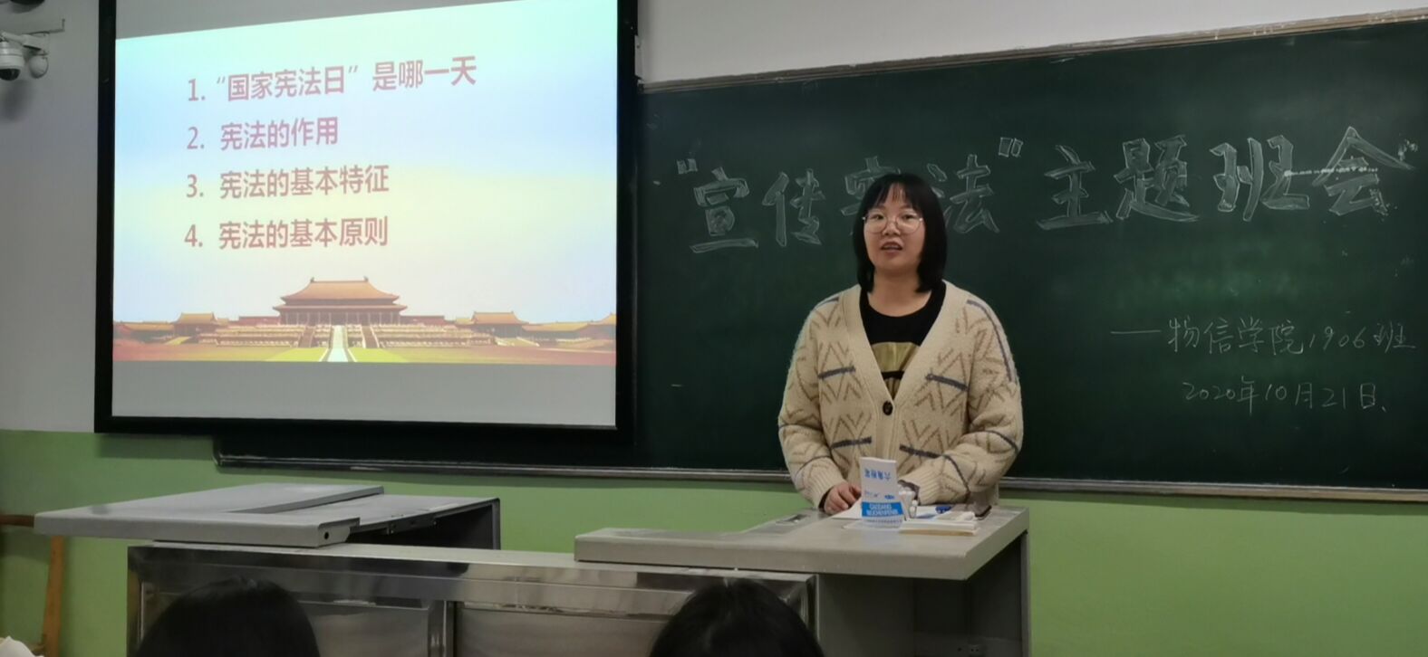 为引导同学们自觉成为宪法的遵守者和守护者,2020年10月21日18:00,公司1906班在01110教室开展了“宣传宪法”主题班会。此次班会由班长张欣怡主持。