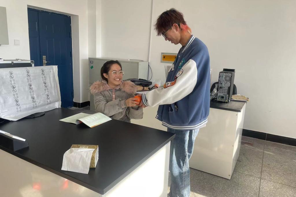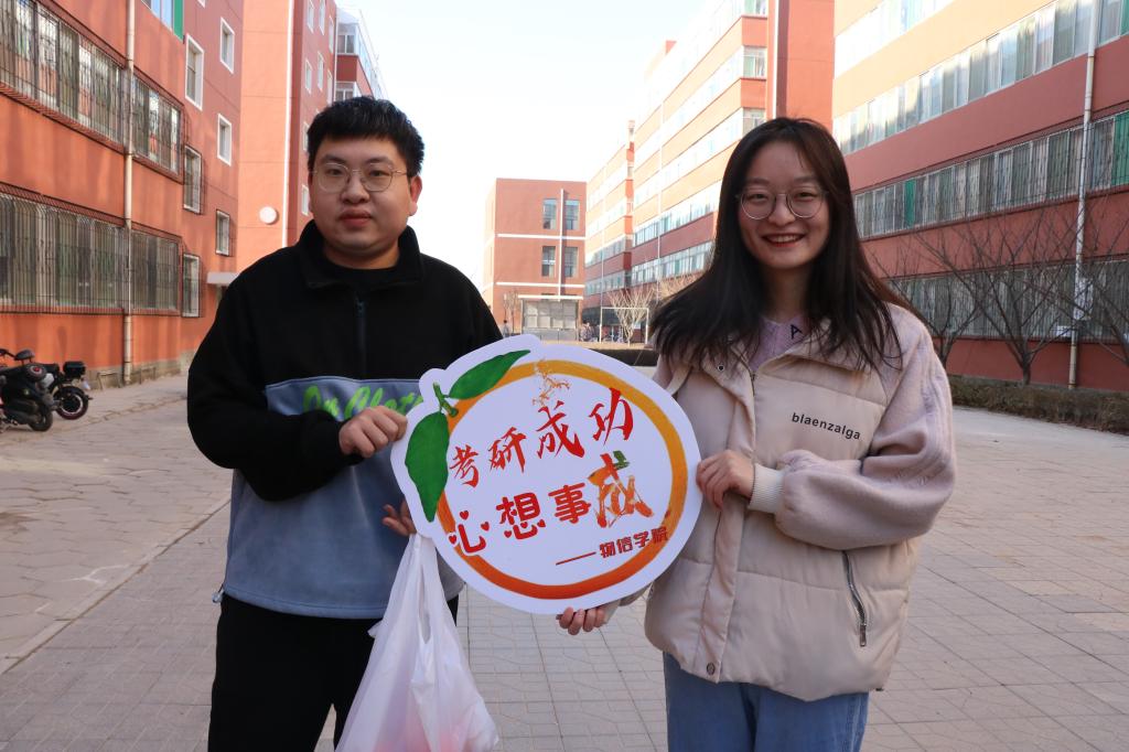 活动中,志愿者们分组行动,分别前往图书馆、实验楼、考研学子宿舍等地,以送橙子的方式,给予公司考研学子心想事“橙”、马到“橙”功的温暖问候和真挚祝福。收到橙子的同学表示十分开心,感受到了公司对考研学子的关心关爱以及学弟学妹作为后盾的加油助威,也会带着大家的关心与祝福轻装上阵。 纵研途漫漫艰险阻,但你们并不孤单,小物一直在保驾护航,助力每位学子乘风破浪。希望这个小小的橙子,能够给考研学子带来温暖,让他们在奋力追梦的路上,不孤单、不畏惧、不退缩。