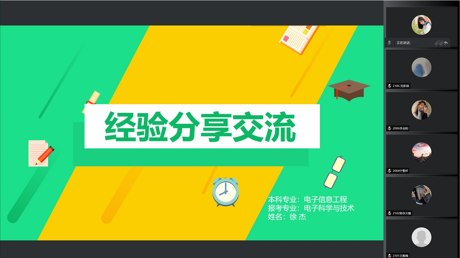为了提高同学们考研的积极性,帮助同学们掌握科学备考方法,5月7日,公司员工会学创部在南区三号楼3104教室举办了“青春向党,研途启航”2022考研经验交流会。此次交流会邀请了考研至哈尔滨工业大学的李永志和考研至山东大学的徐杰为同学们分享学习方法和经验,为准备考研的同学答疑解惑。活动由学创部志愿者肖艳主持。