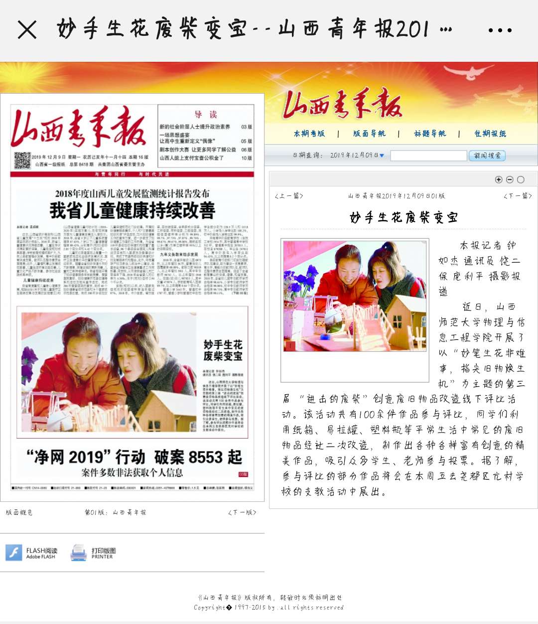 2019年12月9日,山西青年报以“妙手生花废柴变宝”为题首次头版报道了公司青协开展的以“妙笔生花非难事,指尖旧物焕生机”为主题的第三届“进击的废柴”创意废旧物品改造线下评比活动。
