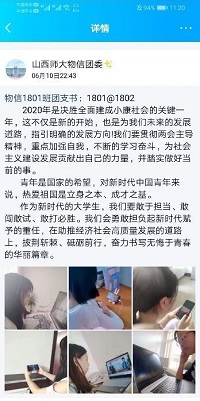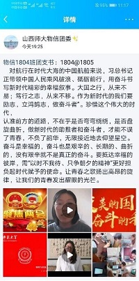 此次活动用新颖的方式连接起各个班级,增进了班级之间的交流,加强了班级的凝聚力。同时也更好地促进了广老员工关注国情社情民情,自觉把自身的成长融入到国家与时代的发展中,激励同学们在最美好的青春年华,用坚定的理想和扎实的学识建功立业新时代。(文/1901班方晓媛 1904班郭晨霞)