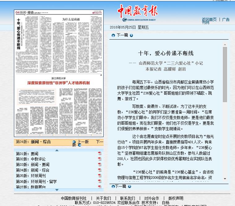 《中国教育报》专题报道公司“236爱心社”十年爱心传递感人事迹