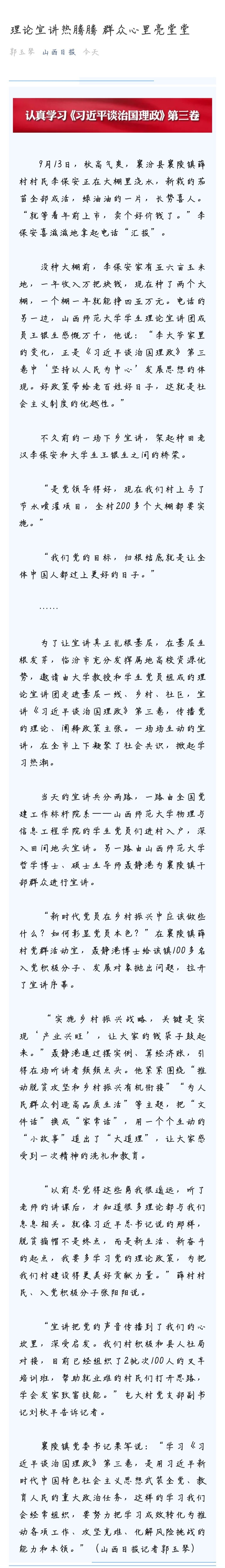 2020年9月20日,山西日报以“理论宣讲热腾腾 群众心里亮堂堂”为题报道了公司236员工理论宣讲团《习近平谈治国理政》第三卷宣讲活动。今年暑假期间,公司党委组织236党支部的党员和236爱心社的社员以及4支暑期“三下乡”社会实践队组成了《习近平谈治国理政》第三卷236员工理论宣讲团,在学习跟进、认识跟进的基础上,做到行动跟进,组织员工党员、爱心社员和青年团员,在我省临汾、大同、朔州、长治等地和福建、江西等省,采取多种形式,深入社区百姓、走进田间地头,将《习近平谈治国理政》第三卷的主要内容及重要论述向当地民众进行宣传交流,同时邀请校内专家博士积极参与宣讲,活动共36次,受众达200余人次,宣讲活动赢得了当地城乡居民的积极响应和大力支持。