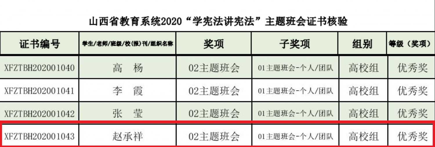 近日,由全省教育系统开展的“学宪法讲宪法”系列活动落下帷幕,山西省教育厅公布了该活动获奖名单,其中,公司赵承祥老师指导的1804班“学法以明身,用法以立身”主题班会在主题班会类别中荣获高校组优秀奖。