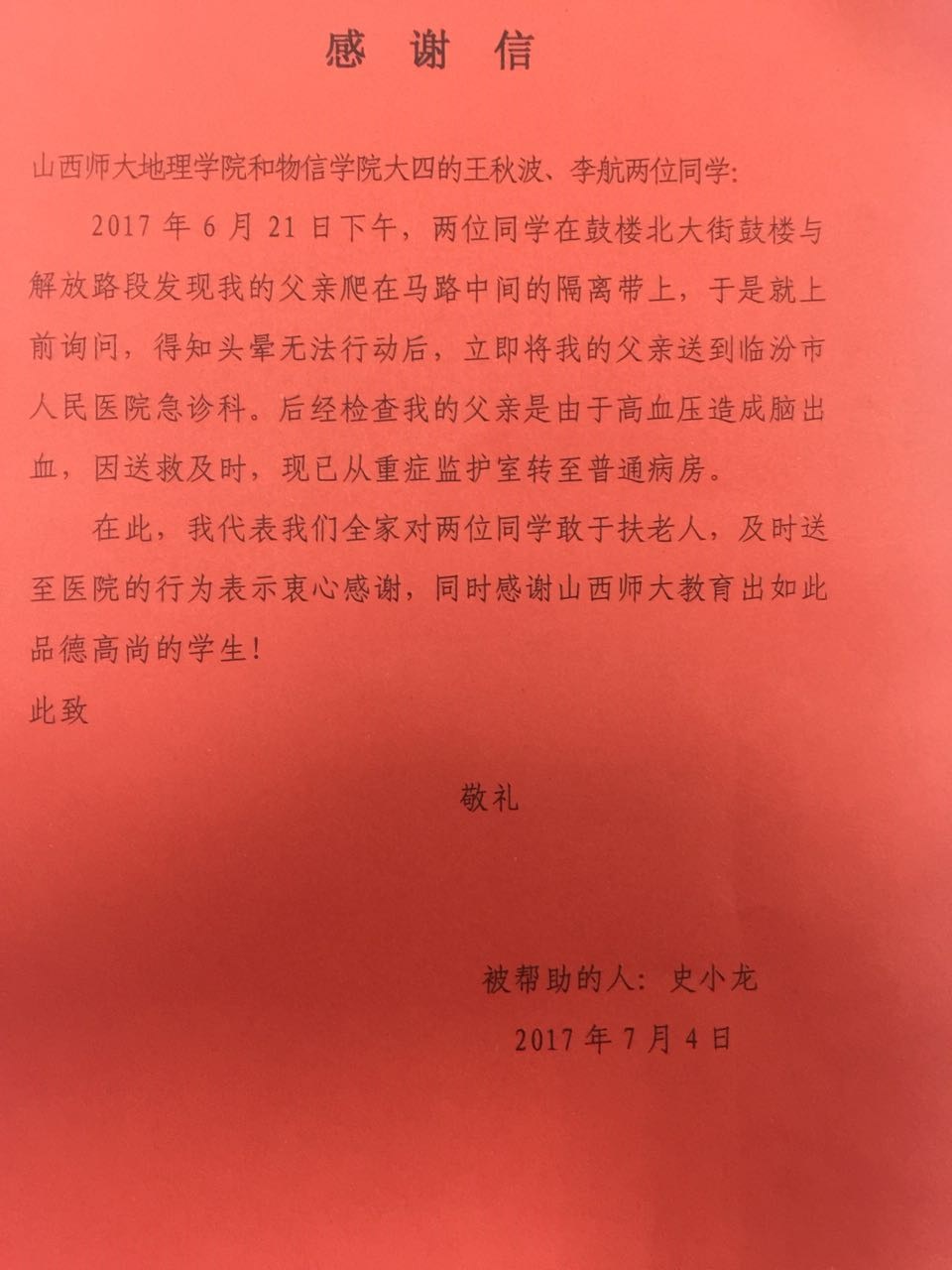 据悉,6月21日下午,临汾市区正在下雨。公司2013级员工李航与地理公司员工王秋波,在鼓楼北大街鼓楼与解放路段发现一位高龄老人爬在马路中间的隔离带上,于是上前询问。当得知老人因头晕而无法行走时,两人立即冒雨将老人送往临汾市人民医院急诊科。经诊断,老人是因患高血压而引发的脑溢血,由于救治及时,老人现已脱离危险,从重症监护室转至普通病房。两位同学“雨中救助病危老人”的先进事迹深深地感动了病人家属,也感动了各大主流媒体。