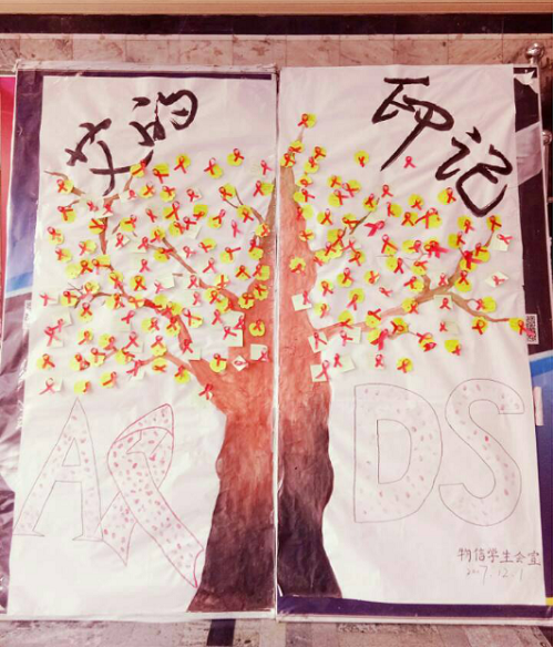 在公司巨人广场,同学们在贴有红丝带的精美便签上写下对艾滋病的认识和感触、对艾滋病患者的亲切寄语,将寄语卡亲手粘贴到“爱心树”上,并在红丝带图样中留下自己的爱心印记。