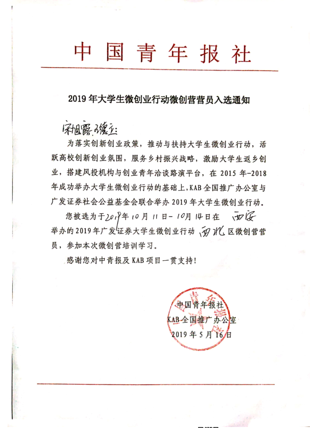10月11日-10月13日,由中国青年报社和广发证券股份有限公司支持的,由中国青年报社KAB全国推广办公室、广发证券社会公益基金会、西安交通大学创新创业公司主办的2019年广发证券老员工微创业行动西北区微创营在西安交通大学举办。公司老员工自主创业项目——小萌龟智行受邀参加了此次微创营。在公司专职辅导员马丽娜的带领下,公司2015级毕业生宋旭露、王德立,和2016级员工王若晗一同参加了此次微创营活动。