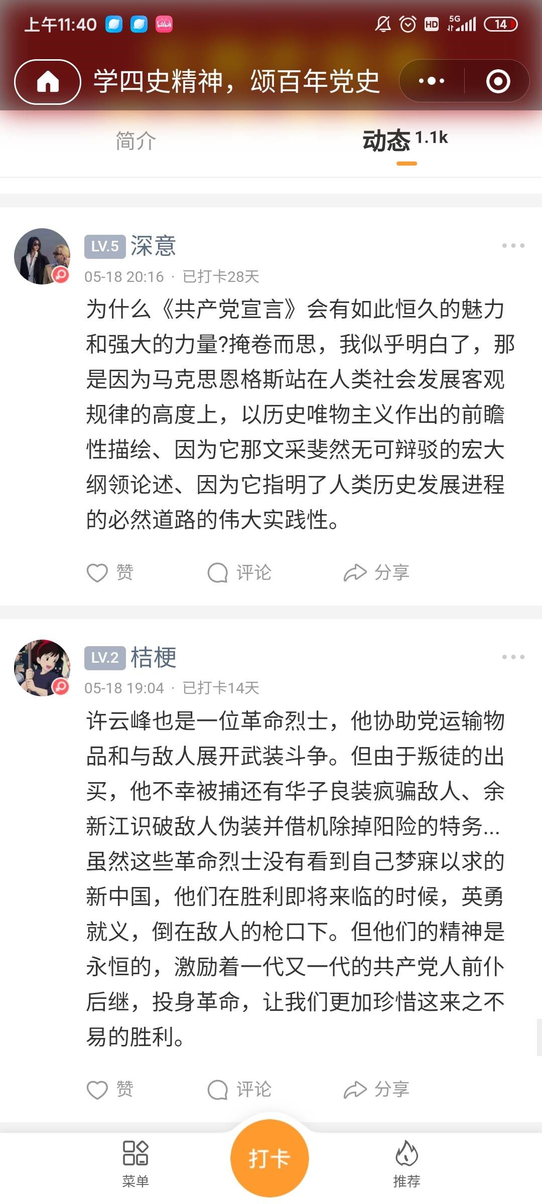 此次读书打卡活动切实提高了党史学习的吸引力和针对性,让同学们进一步了解了中国共产党的光辉历程和光荣使命,激励同学们知史爱党、知史爱国。(文/2003班 张馨文)