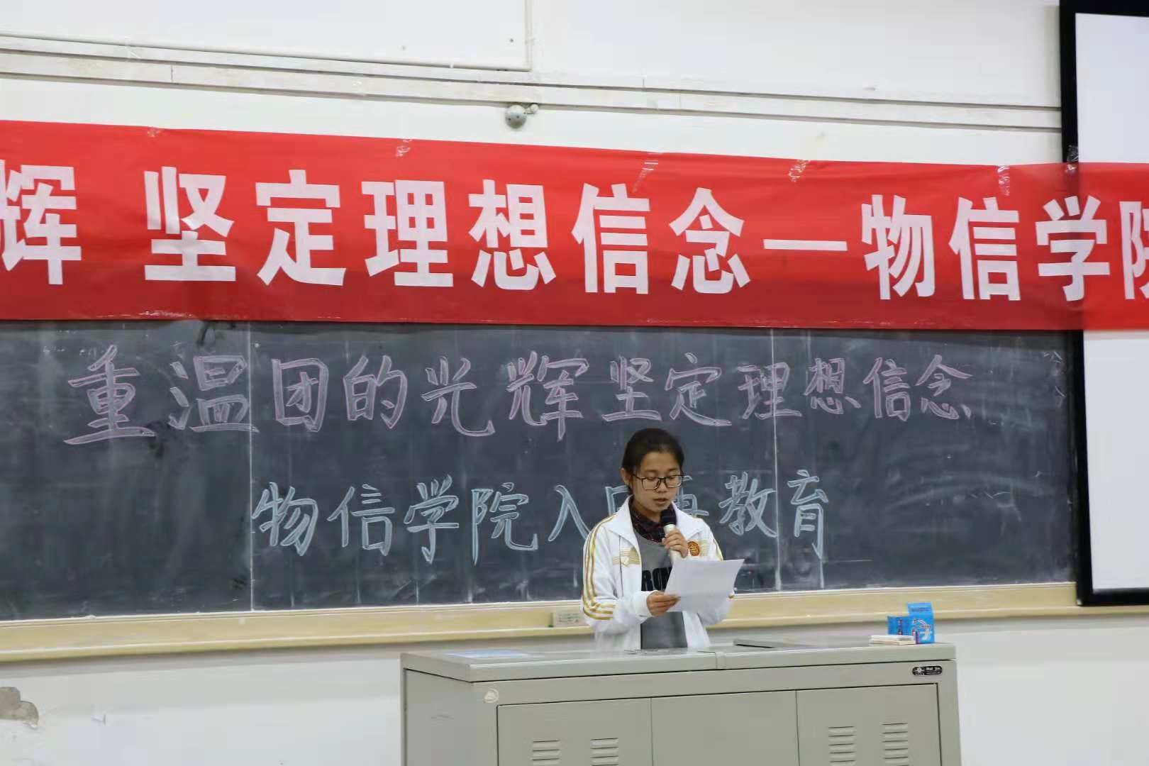 2017级优秀团员夏娇带领大一团员学习了中国共青团历史沿革,明确了共青团现阶段的三大任务,着重介绍了团旗、团徽和团歌,重温了团章和入团誓词。