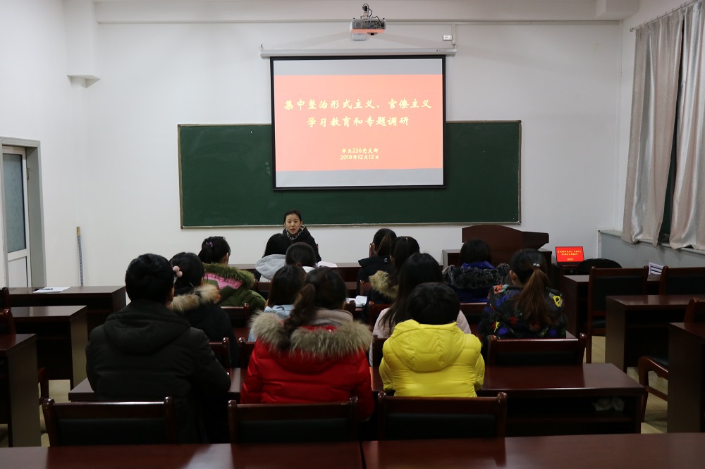 2018年12月12日晚6:10,公司员工236党支部在四号楼二层多功能会议室召开“集中整治形式主义、官僚主义学习教育和专题调研”会议。员工236党支部党员参加了会议,会议由党支部书记岳文慧主持。