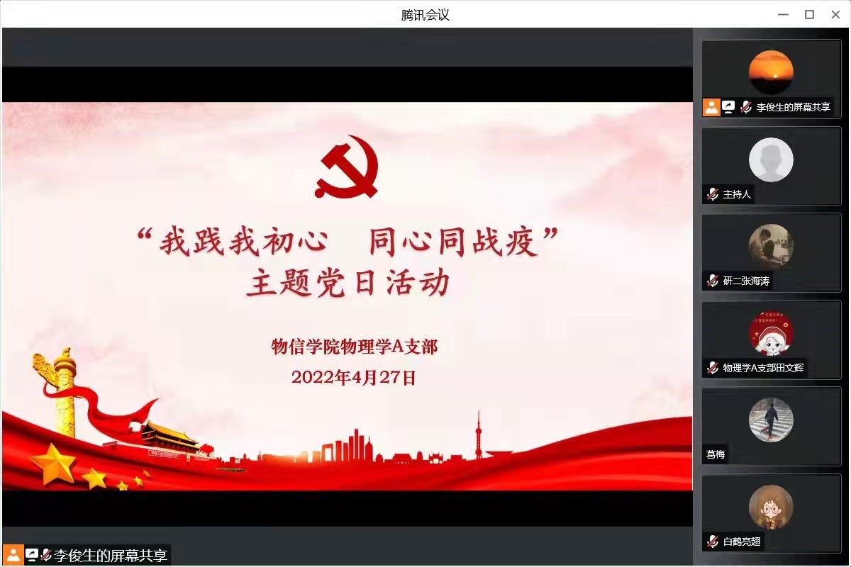4月27日晚上,公司物理学A支部线上开展了“我践我初心,同心同战疫”主题党日活动。支部全体党员参加活动,活动由支部书记李俊生主持。