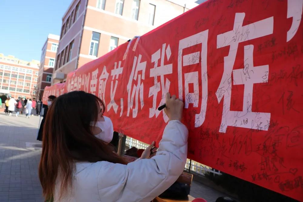 本次活动吸引了众多同学积极参与,寒风中大家一手拿着笔,一手抵着横幅,认真签下自己的名字,并在便利贴上写下自己的美好祝福和期待粘贴在海报上,对艾滋病患者表达最诚挚的祝愿。参与活动的同学们还领取了写有关于预防艾滋病知识的小卡片以及手工制作的象征着艾滋病国际符号的红丝带。