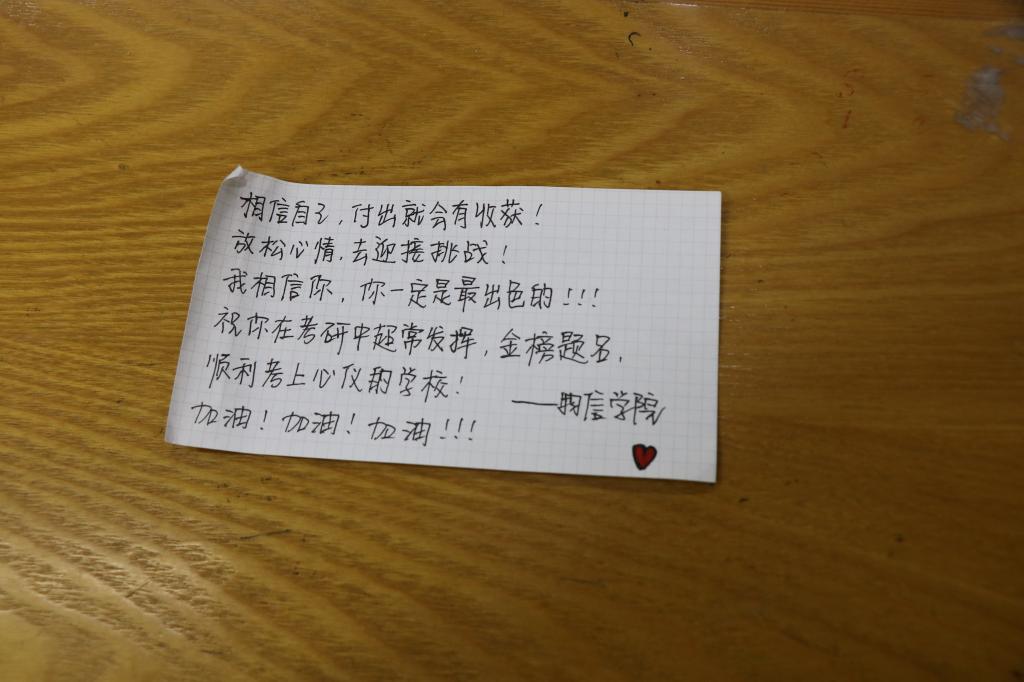 活动工作人员面向公司员工征集对考研学子的真切祝福,并将这些承载着鼓励与祝福的卡片在图书馆和自习室进行了发放。突然收到祝福的考研学子或表示惊喜或表示感动,大家纷纷表示,这些暖心的话语缓解了自己即将考研的焦虑,他们将会调整好状态,奋力一搏,用最好的状态面对考试。(文/2101班 李天博 摄/2106班 任超宇)