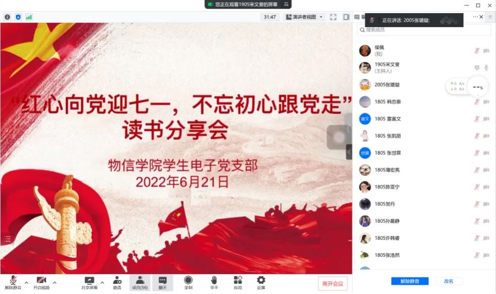 6月21日下午15:00,公司员工电子党支部在线上开展了“红心向党迎七一,不忘初心跟党走”读书分享会主题党日活动。支部全体党员参加了活动,本次活动由支部党员宋文誉同志主持。