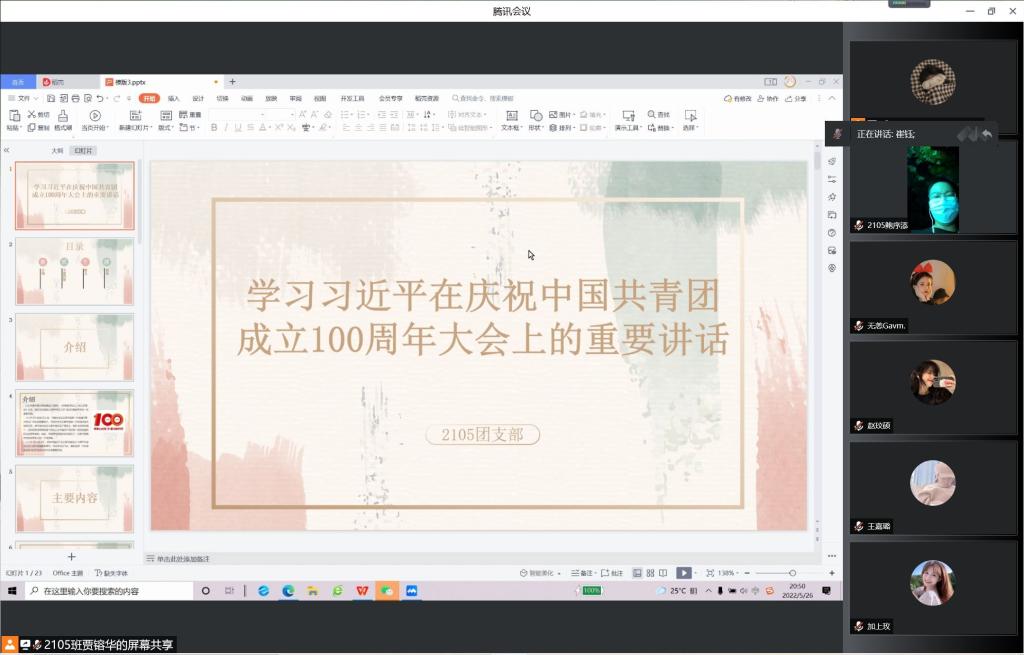 活动中,各班团支书带领同学们学习了习近平总书记在庆祝中国共产主义青年团成立100周年大会上的重要讲话,回顾了中国共产主义青年团自诞生到现在的百年历史。1906班团支书王娜强调:作为一名团员,我们要紧密地团结在以习近平同志为核心的党中央周围,始终牢记、忠实践行习近平总书记对共青团和青年工作的期望与要求,并明确自己所肩负的社会责任。同学们纷纷表示,作为当代青年,应当谨记习近平总书记的教诲,牢固树立共产主义远大理想,自觉担当责任,在我们这一代的新长征路上贡献出自己的青春力量。