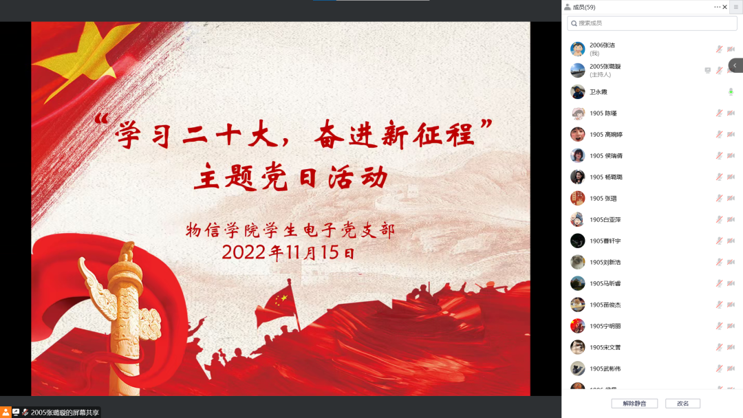 11月15日,公司员工电子党支部通过腾讯会议线上开展了“学习二十大,奋进新征程”主题党日活动。本次活动由张璐璇同志主持,支部全体党员参加了活动。