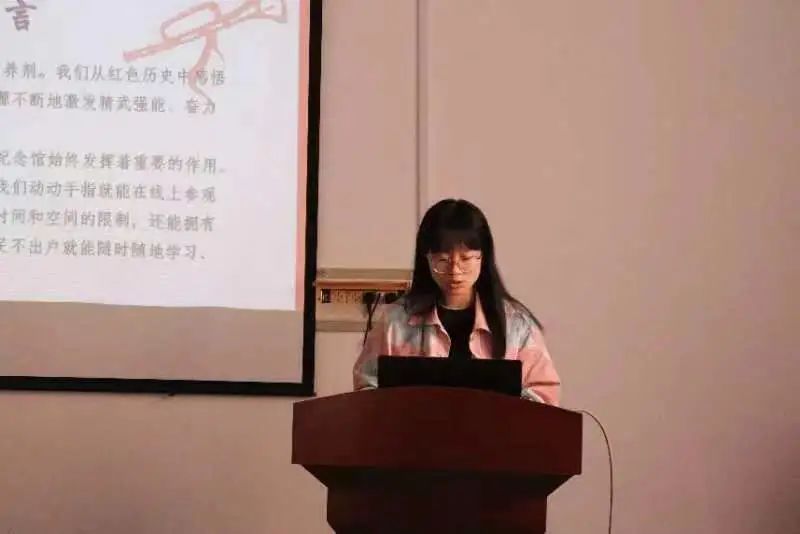 活动中,2102班团支书耿鑫雨首先向大家介绍参观红色基地除了可以实地参观,也可以通过VR全景技术足不出户就能学习红色文化。此外,她还通过PPT带领大家线上参观了在党的旗帜下前进——人民军队庆祝中国共产党成立100周年主题展览、纪念中国人民志愿军抗美援朝出国作战70周年大型展览和伟大的变革——庆祝改革开放40周年大型展览等三个具有时代性历史性意义的大型展览,并按历史时间线介绍了每个展览的主要内容。交流讨论环节,同学们表示,学习党的历史就是我们青年成长成才最好的营养剂,在今后的学习生活中要继续继承和发扬革命精神,学习红色文化,打牢专业知识,在砥砺奋进中与祖国共命运、与时代共成长。(文/2202班 王怡璇 摄/2204班 肖寄)