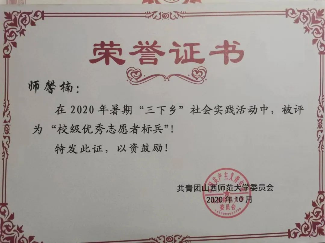 2020 年暑期“三下乡”社会实践活动 “校级优秀志愿者标兵”