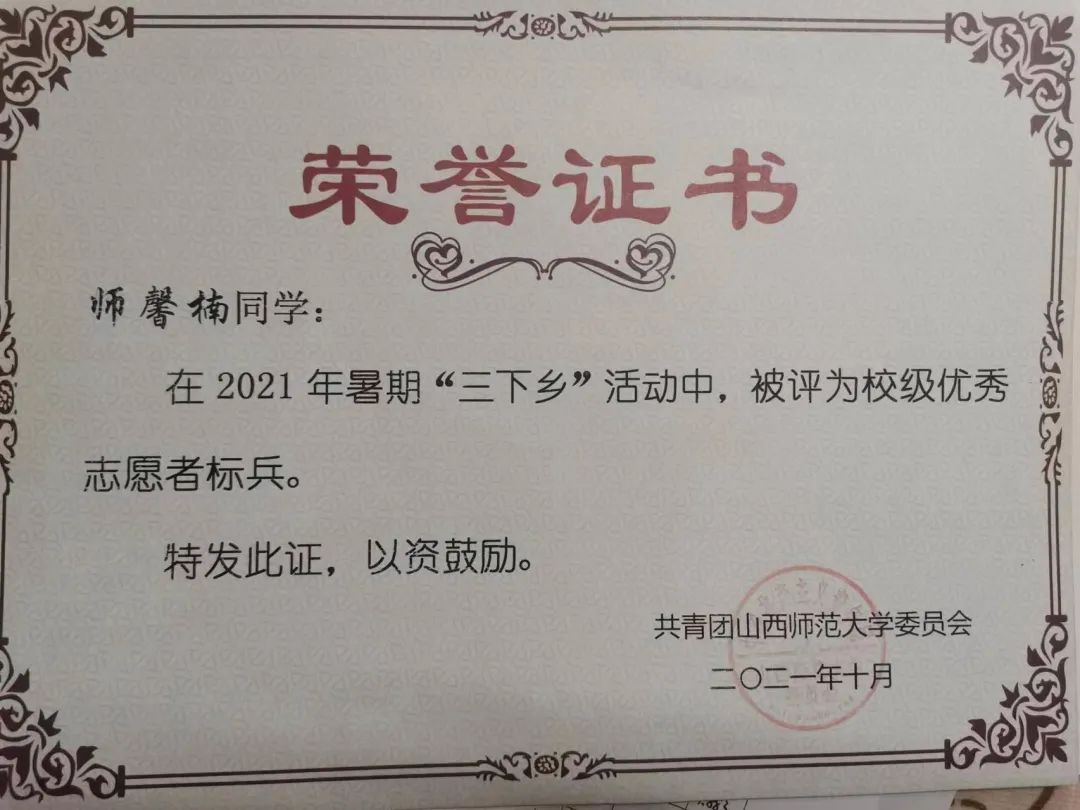 2021 年暑期“三下乡”社会实践活动 校级优秀志愿者标兵