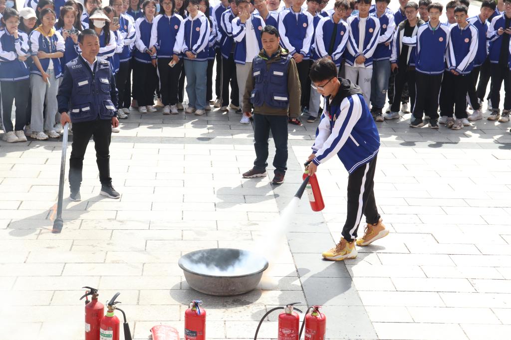 警报声响起、烟雾弥漫,消防演习正式拉开序幕。同学们迅速冲出教室,有序下楼,以最快速度在疏散场地集合。疏散集合完毕后,同学们以班级为单位,由对应志愿者带领来到图书馆前的空地。随后,保卫处老师向大家详细讲解了逃生自救指南和日常生活中预防火灾方法以及使用灭火器的具体步骤,并在同学们面前进行了灭火器的使用演示。部分同学还在保卫处老师的指导下提着灭火器对演习火场进行扑救。
