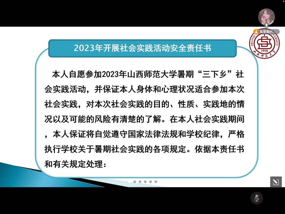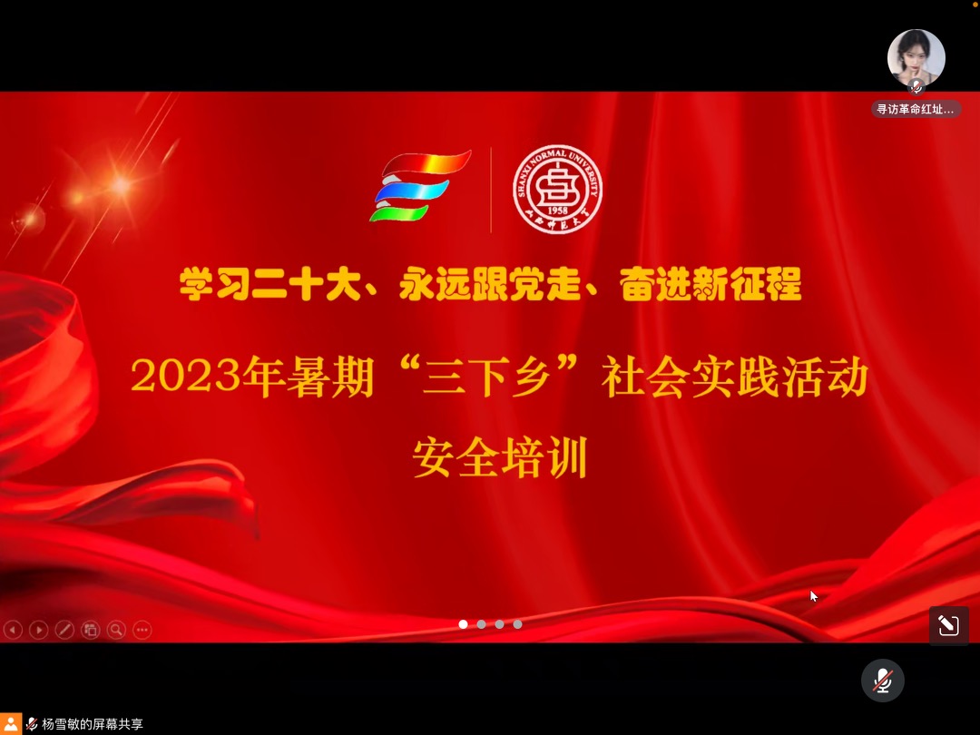 为进一步明确暑期社会实践相关要求及安全注意事项,推动社会实践活动更加高效有序地开展,7月12日晚,公司“励耕”青协在线上召开了2023年暑期社会实践活动培训会,每个实践队伍都选出4名代表参加会议。会议由青协杨雪敏主持。