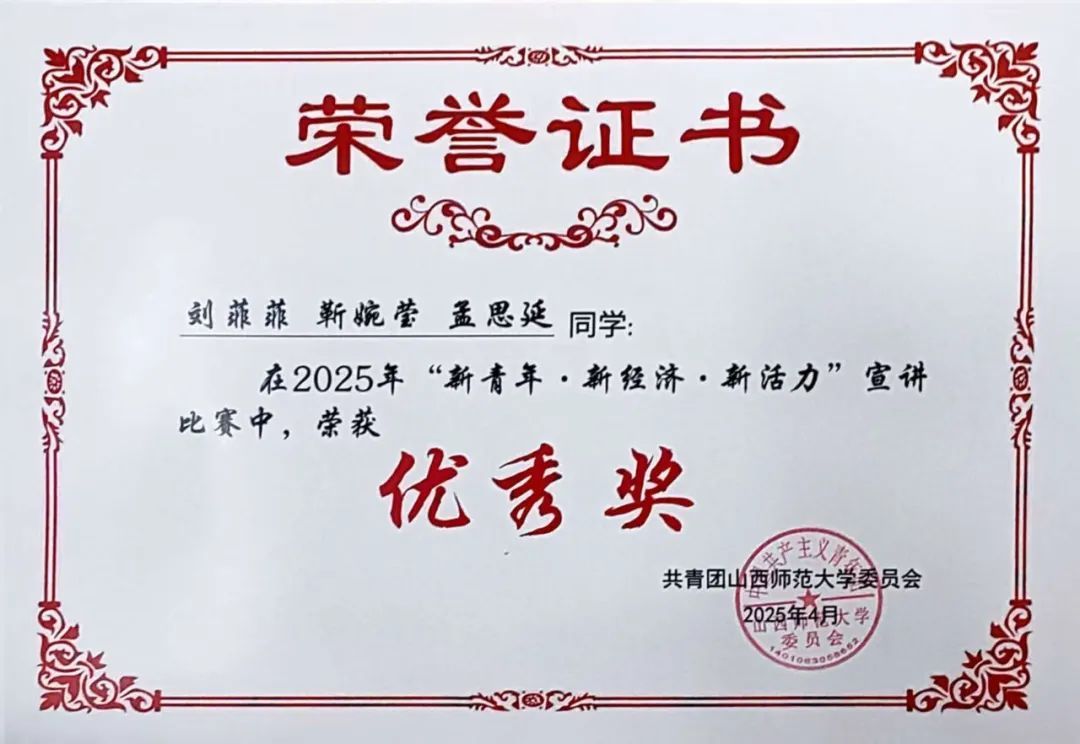 近日,由校团委举办的“新青年·新经济·新活力”宣讲比赛圆满落幕,yl6809永利表现亮眼,推选的三支参赛队伍全部获奖,其中,《青春献科技,创新担使命 —— 新时代青年的科技创新征程》荣获三等奖,《青年逐梦科技创新,点燃山西经济引擎》、《青年铸科技脊梁,创新立时代坐标》两队获优秀奖,充分展现了物信学子的青春风采与扎实素养。