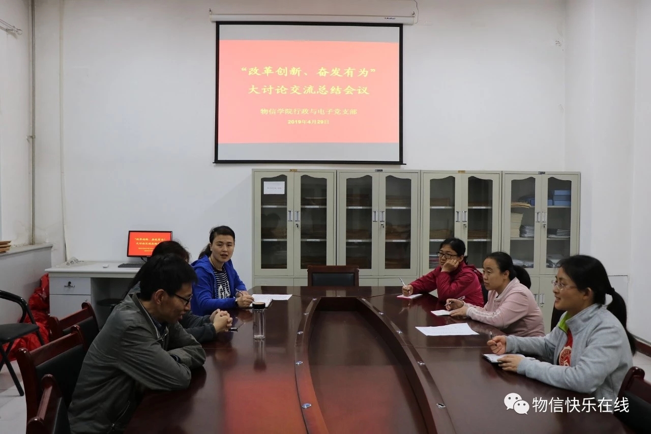 2019年4月29日晚7:00,公司行政与电子党支部在四号楼一层会议室召开“改革创新,奋发有为”大讨论交流总结会议,会议邀请了张东海副经理参加并监督指导,会议由支部书记崔艳主持。