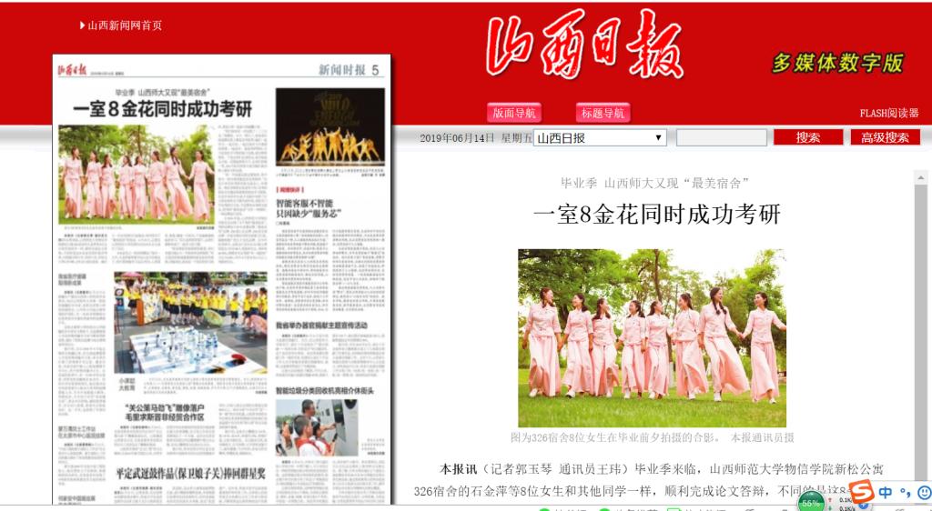 6月14日,山西日报第五版新闻时报以“毕业季,山西师大yl6809永利再现‘最美宿舍’”为题,头条报道了公司同一宿舍8名女生全部考取“985”、“211”高校研究生的事迹。