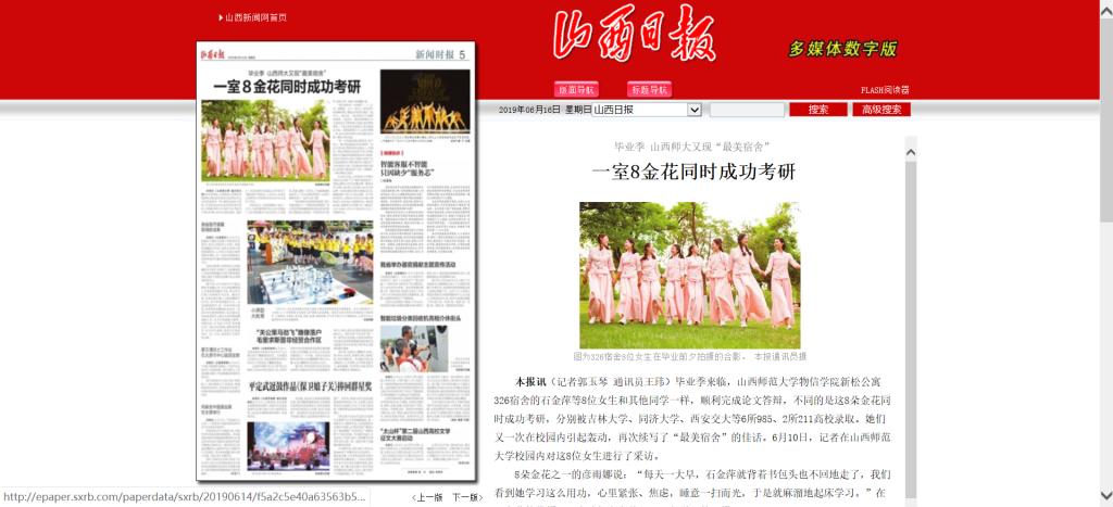 6月14日,山西日报第五版新闻时报以“毕业季,山西师大yl6809永利再现‘最美宿舍’”为题,头条报道了公司同一宿舍8名女生全部考取“985”、“211”高校研究生的事迹。