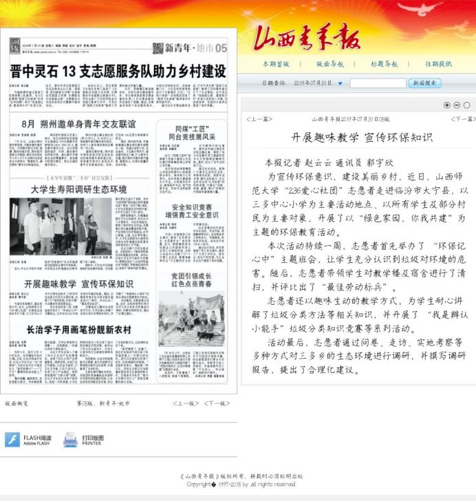 2019年7月31日,山西青年报以“开展趣味教学 宣传环保知识”为题,报道了236爱心社“绿色家园,你我共建”主题环保教育活动。