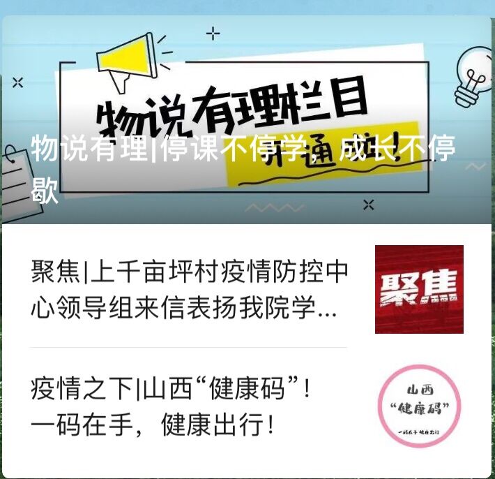 3月6日,一档全新的思政栏目“物说有理”在公司公众平台“物信快乐在线”正式上线,并推出第一期主播推文作品——《停课不停学,成长不停歇》。作品以一场突如其来的疫情为契机,以一次全新的学习模式为主题,引导物信学子在非常时期稳住心神,积淀成长、砥砺前行。栏目一经推出,便以其温婉的表达、硬核的内容和清新的形式赢得了同学们的喜爱,获得大家的一致好评,同学们在关注聆听的同时纷纷留言转发。