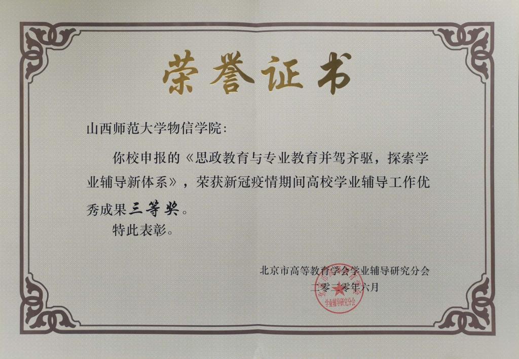 近日,在北京市高等教育学会学业辅导研究分会组织开展的“新冠疫情期间高校学业辅导工作优秀成果”评选活动中,在校学工部(员工处)的支持下,由公司选送的《思政教育与专业教育并驾齐驱,探索学业辅导新体系》项目获评三等奖。此次“新冠疫情期间高校学业辅导工作优秀成果”评选活动共有清华大学、北京大学、南开大学、华中科技大学等30余所高校参加评选,共评选出一等奖9项,二等奖11项,三等奖10项。