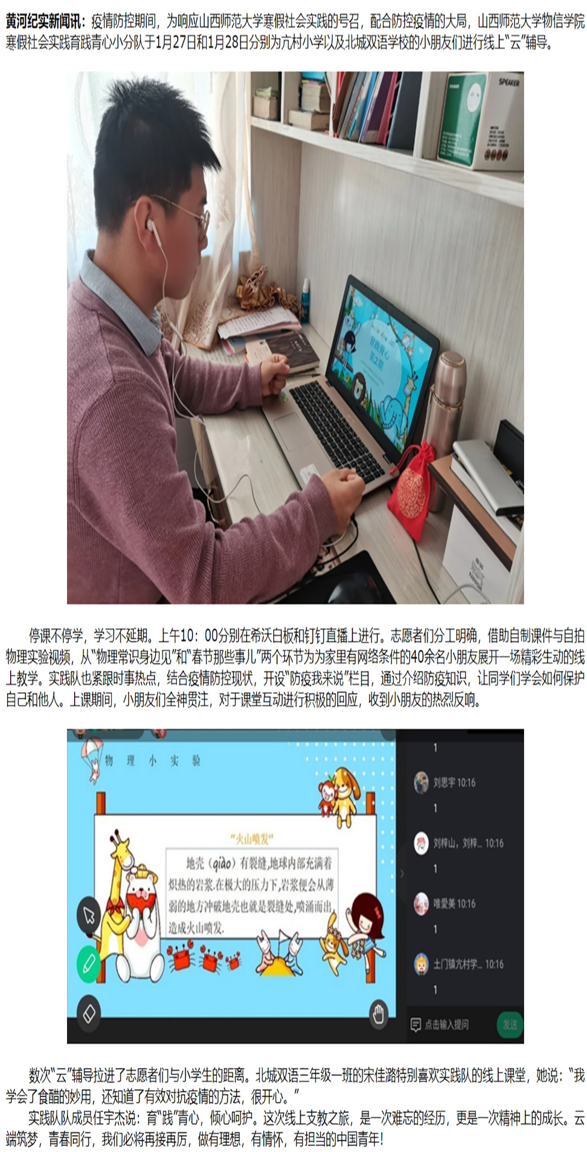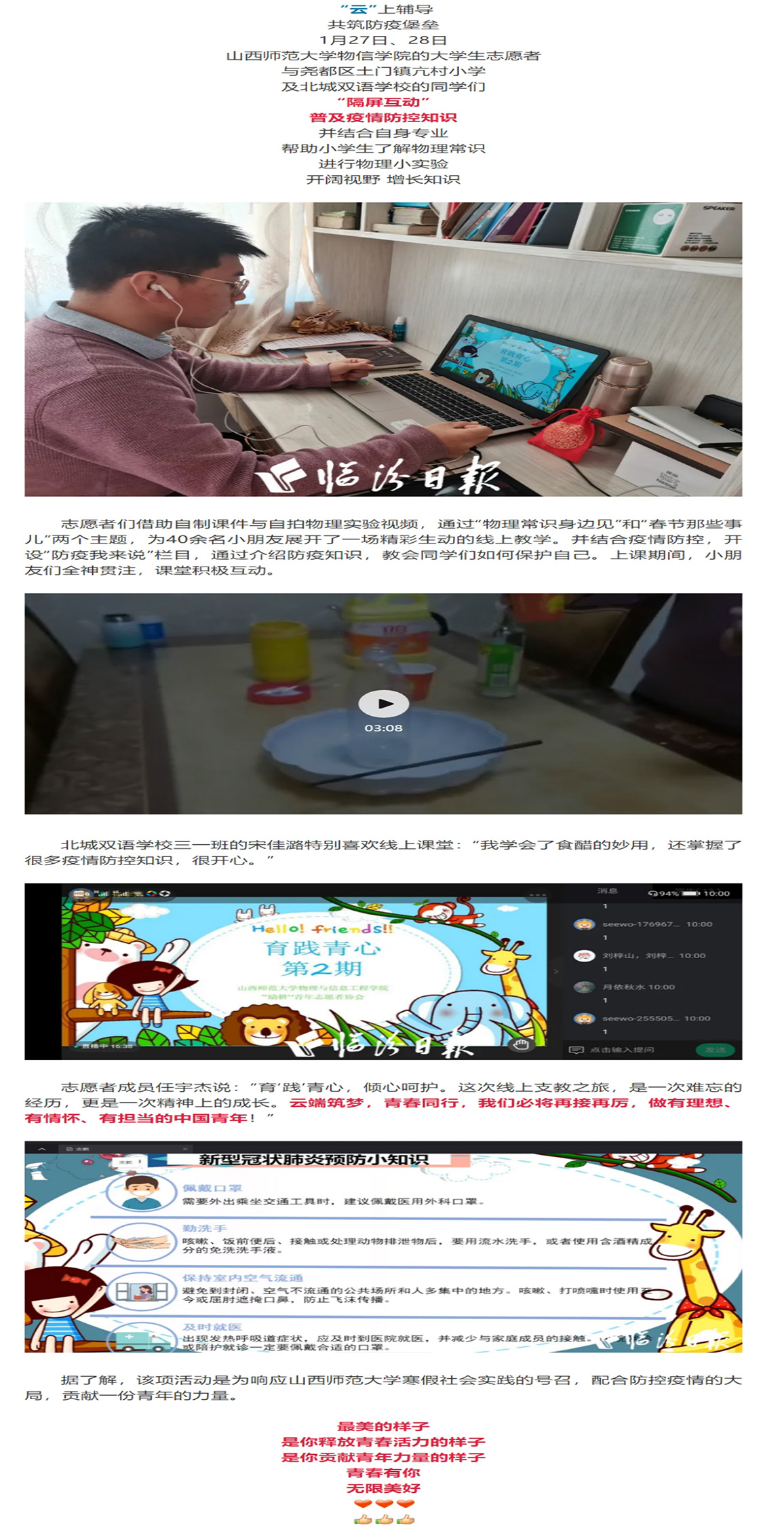 黄河纪实新闻网、临汾日报分别于1月29日、1月31日以“云端筑梦,青春同行 山西师大志愿者为小员工线上‘云’辅导”“山西师大志愿者,好样的!”为题报道了公司寒假社会实践队——育践青心小分队为亢村小学以及北城双语公司的小朋友们进行的线上“云”辅导活动。