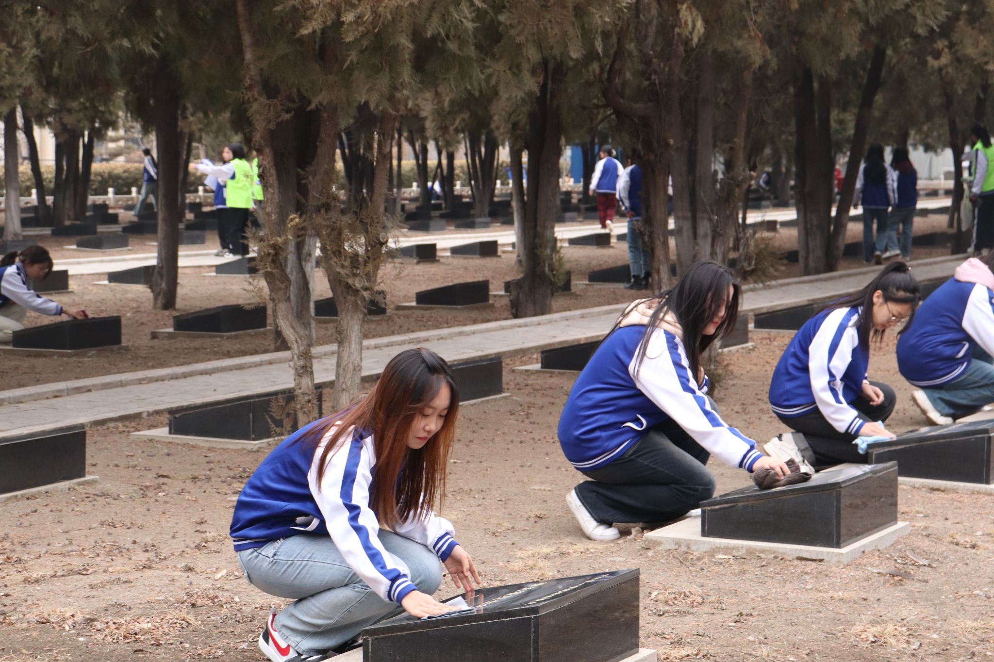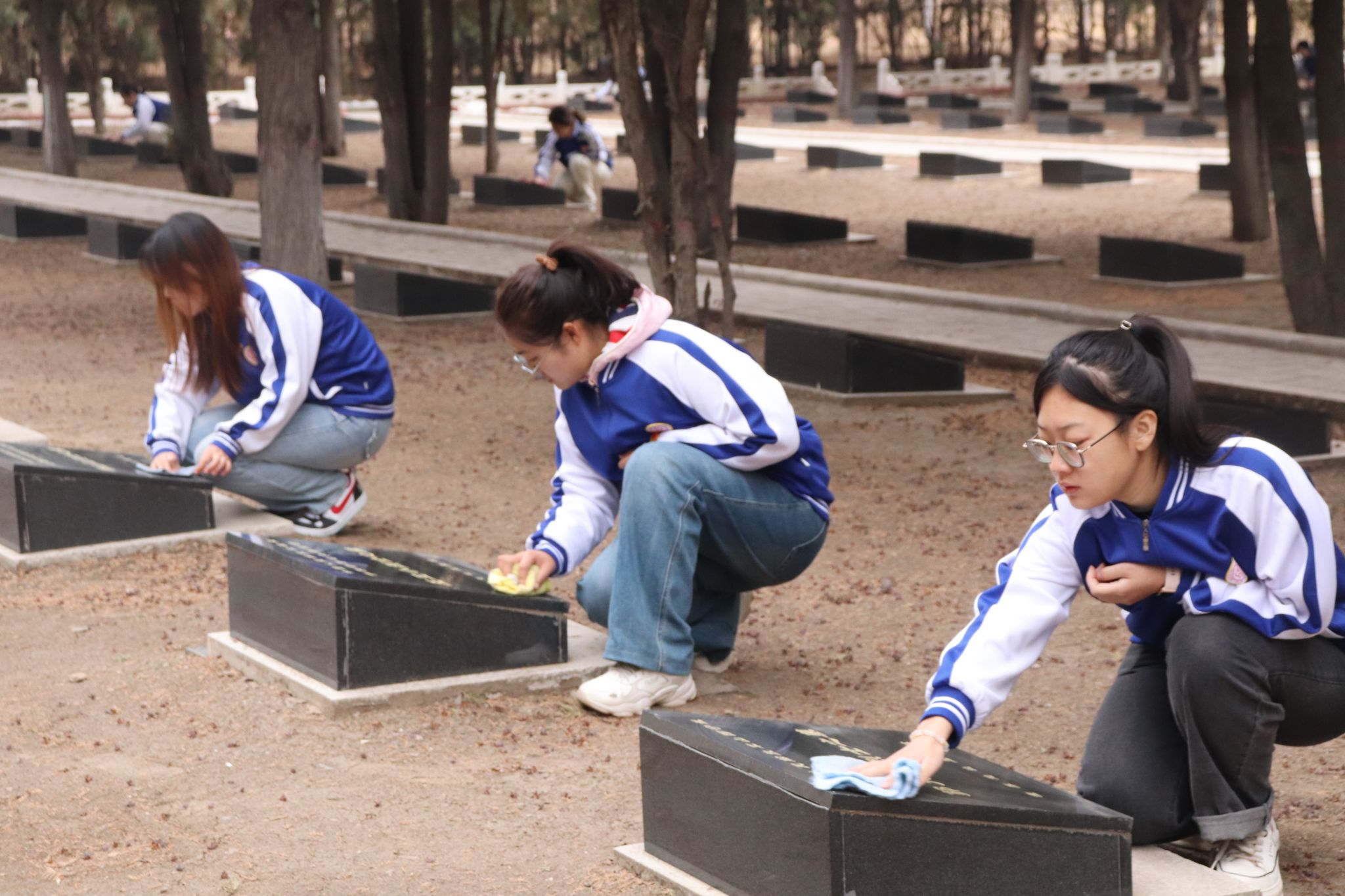 最后,青马学员在青协志愿者们的带领下,怀着无比崇敬的心情,认认真真地为烈士们清扫“落在肩上的灰尘”,经过大家的辛勤擦拭,烈士墓碑焕然一新。