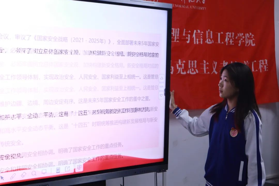 活动中,同学们共同观看了央视综合频道播出的《在总体国家安全观创新引领下》专题宣传片。随后,2303班团支书王晓颖详细讲述了国家安全的内涵及当前的国际形势挑战,让同学们认识到守护国家安全的重要性,了解了青年的责任与使命,意识到青年应当挺膺担当。交流讨论环节,同学们纷纷表示,国家安全需要我们广大青年共同捍卫,要增强忧患意识,树立底线思维,做好国家安全的个人防线,做好国家安全的守护者。