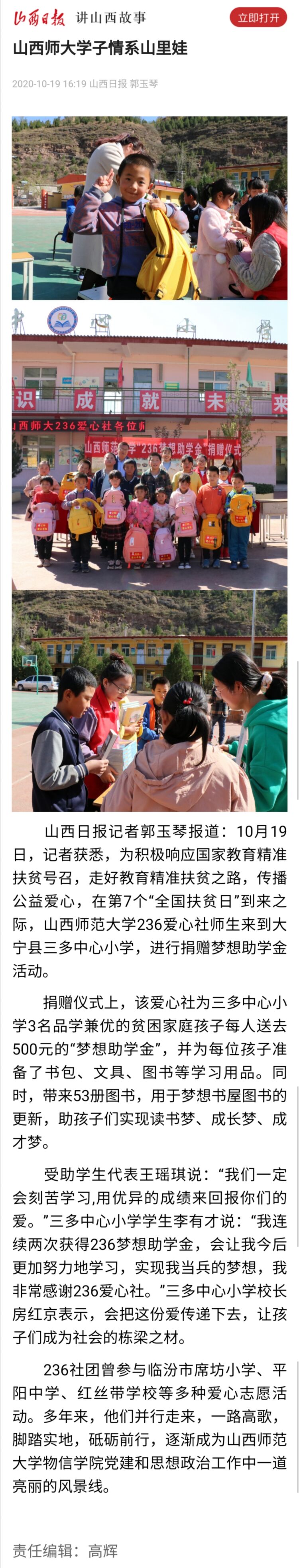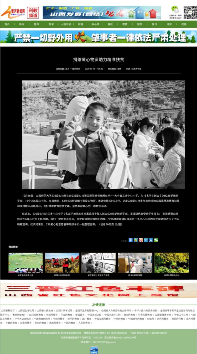 10月19日,山西日报客户端以“山西师大学子情系山里娃”为题,黄河新闻网科教频道以“捐赠爱心物资助力精准扶贫”为题,分别报道了公司236爱心社在大宁三多小学开展的“全国扶贫日”爱心捐赠活动。